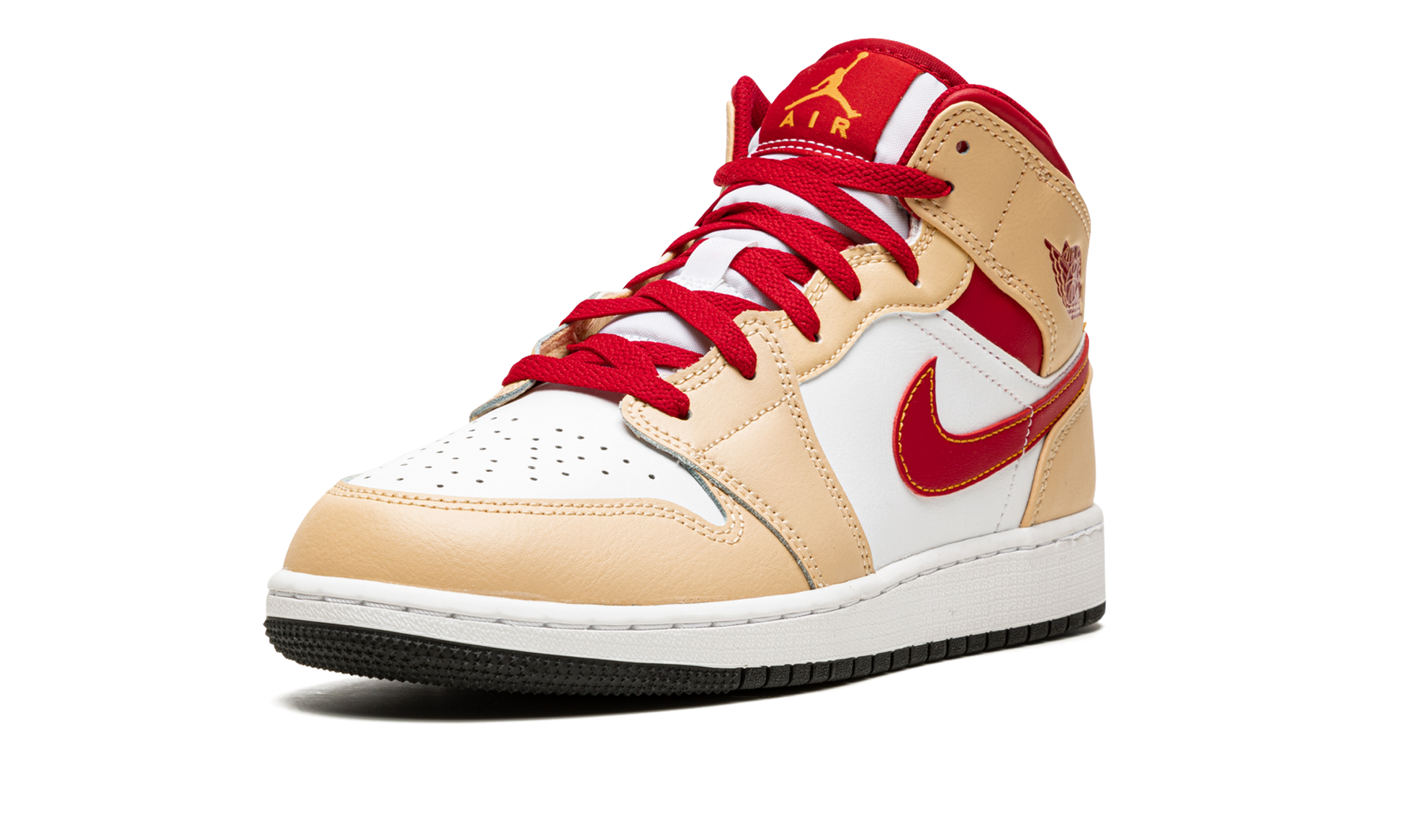 The Air Jordan 1 Mid GS “Beige/Redâ€?is the youth sizing of Michael Jordan's first signature shoe in a head-turning colorway that combines vibrant red accenting with beige details. The popular look for the Jordan 1 Mid GS features white leather on the perforated toe and mid-panel. and Light Curry-colored leather on the forefoot. eyelets. collar. and heel. A fiery red Swoosh with beige contrast stitching draws attention on the sides of the shoe. A red “Wingsâ€?logo appears on the collar and beige Jumpman detailing is found on the red nylon tongue tag on the white nylon tongue.