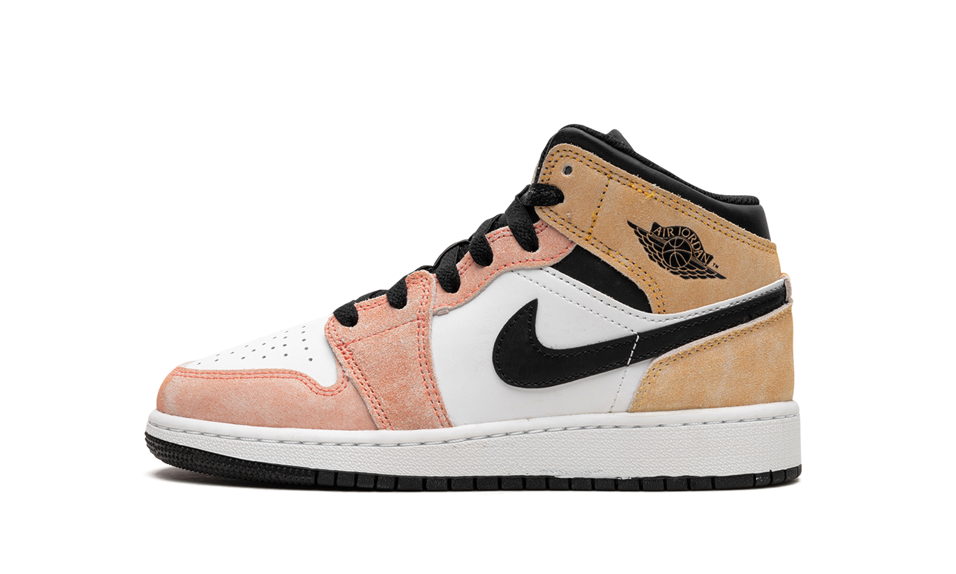 The Air Jordan 1 Mid GS “Flight Clubâ€?is the youth sizing of the mid-top lifestyle shoe with multi-color overlay panels. The “Flight Clubâ€?Jordan 1 Mid features a white leather base with contrasting faded pink suede on the toe cap. forefoot. and eyelets. Faded orange suede is found on the collar and heel. A black leather Swoosh logo is located on the sides. Classic “Wingsâ€?branding is located on the collar. A yellow Jumpman is embroidered on the black nylon tongue.
