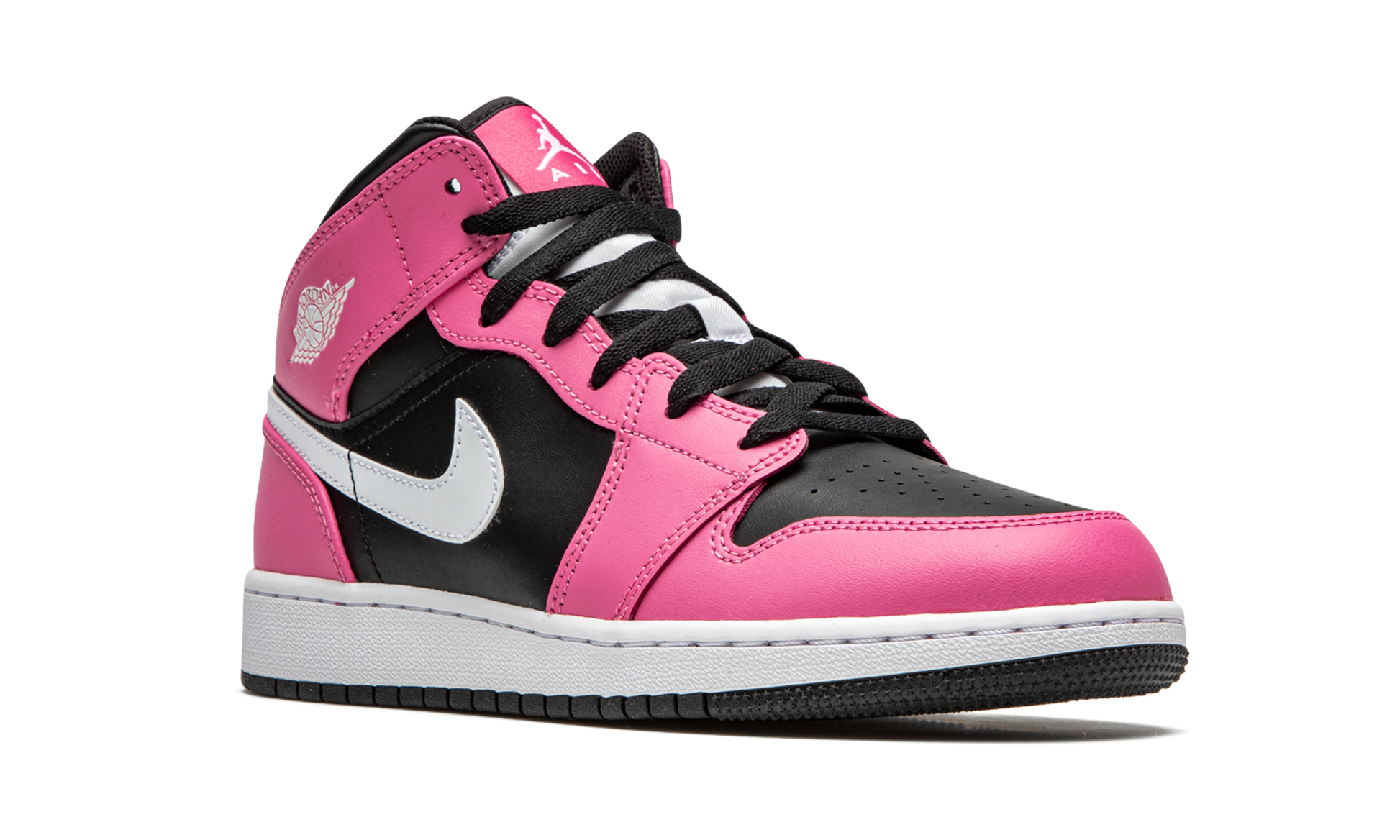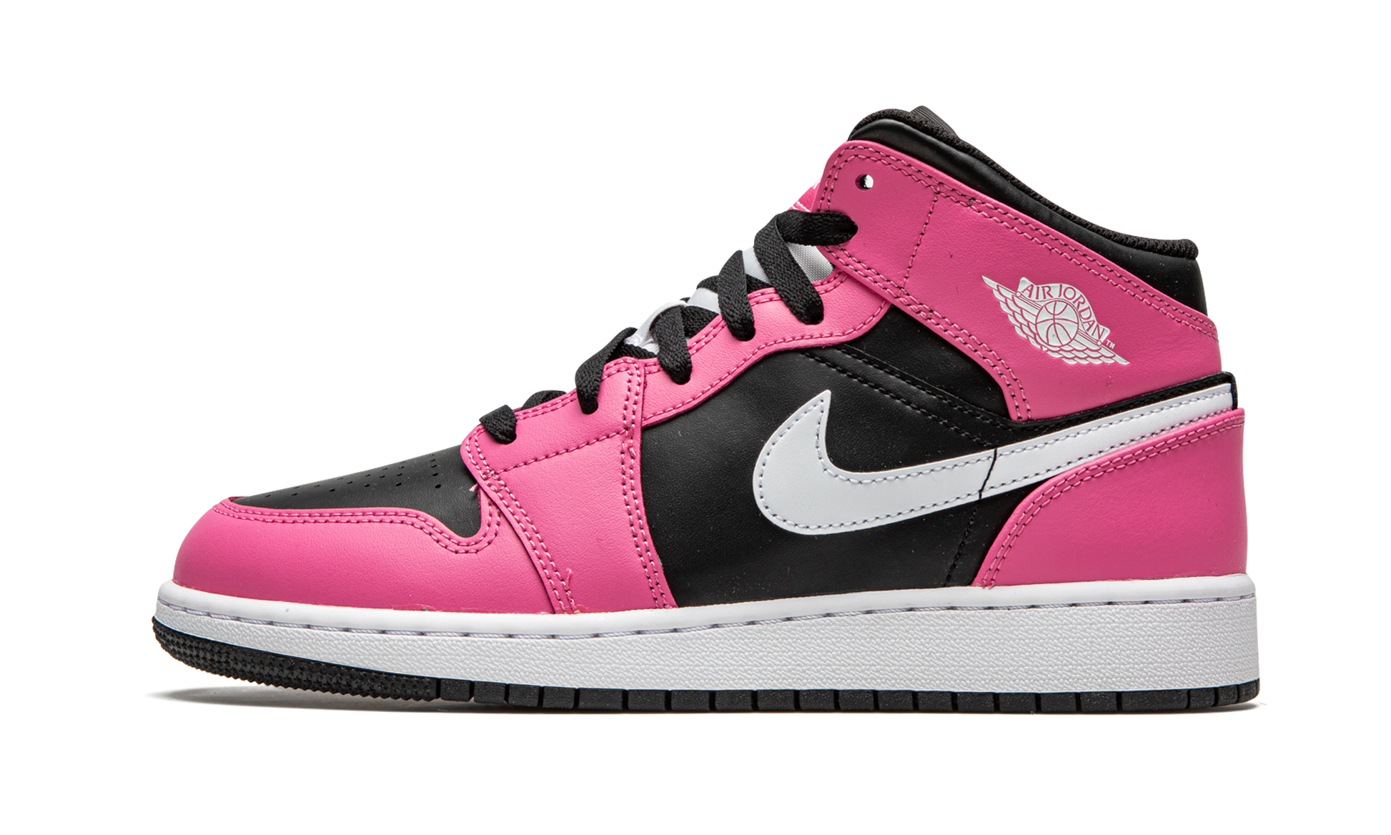 The Air Jordan 1 Mid GS “Pinksicleâ€?is a fun colorway of Michael Jordan's timeless signature shoe scaled down to mid-top form. Black leather appears on the perforated toe and mid-panel. Pink leather overlays can be found on the model's forefoot. eyelets. collar. and heel. White “Wingsâ€?detailing graces the collar and white leather Swoosh branding covers the mid-panel. The white nylon tongue features a pink nylon branded tongue tab with Jumpman accenting. This small Air Jordan 1 Mid for grade schoolers is finished off with a white rubber midsole and black outsole.