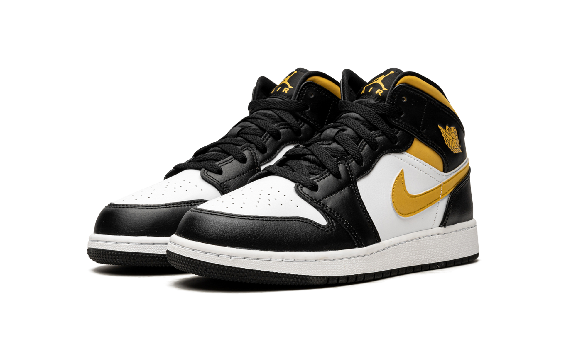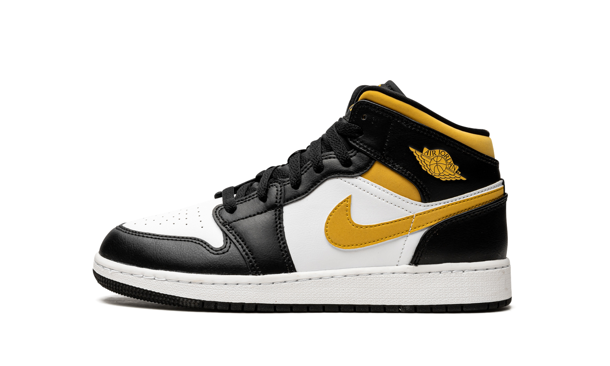 The Air Jordan 1 Mid GS “Pollen/White/Blackâ€?is a youth-sized version of Michael Jordan's first signature shoe in clean. ultra-wearable color scheme. The “Pollen/White/Blackâ€?features white leather on the perforated toe and black leather on the surrounding forefoot and eyelet panels. The rest of the design deviates from the “Black Toe'sâ€?color block. A yellow leather Swoosh appears on both sides and a yellow “Wingsâ€?logo graces the black leather overlay on the collar. Additional Pollen accenting highlights the Jumpman and “Airâ€?branding on the black tongue tag on the black nylon tongue and the leather collar. A cream midsole and black rubber outsole complete the look.