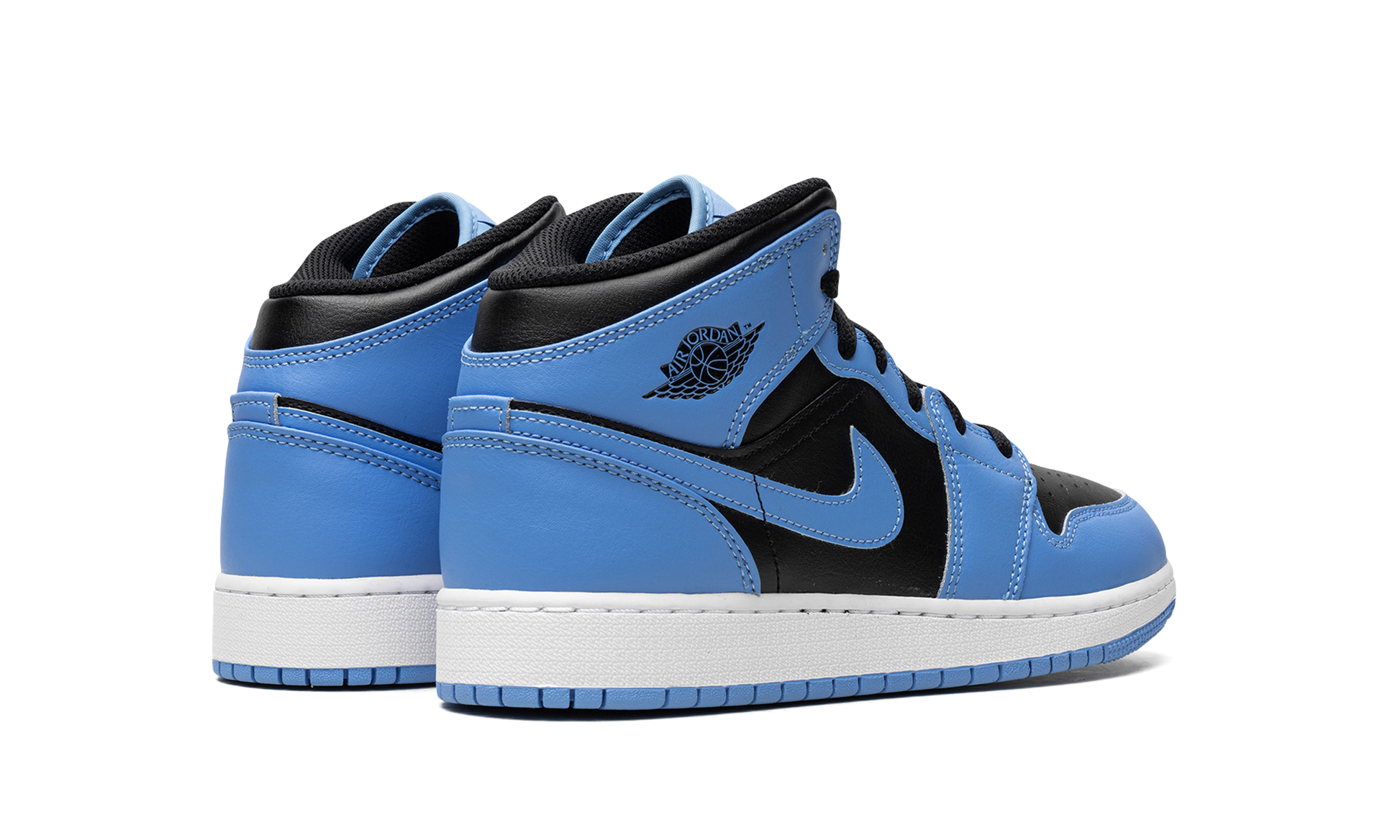 The Air Jordan 1 Mid GS "University Blue/Black" is the youth sizing of the colorway of the popular shoe with a mostly two-tone look. The “University Blueâ€?theme is loosely inspired by Michael Jordan's alma mater. the University of North Carolina. as the light blue hue nods to the primary color found on the jerseys of the school's athletic teams. As for the design. the colorway features a black leather construction with University Blue leather overlays and Swoosh branding on the sides. A “Wingsâ€?logo appears on the collar and a Jumpman is seen on the tongue tag. The white rubber midsole and University Blue-colored rubber outsole complete the look. Release date: May 1. 2023