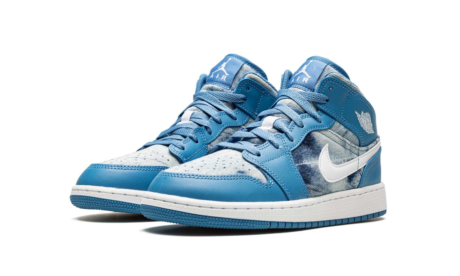 The Air Jordan 1 Mid GS “Washed Denimâ€?brings another unique look to the celebrated sneaker. The eye-catching colorway features a bleached denim material for its base. while the leather overlays around the forefoot. tongue and across the heel sport a rich blue hue. Profile Swooshes and wings insignias on the lateral ankle flap favor a clean white look. which also lands on the midsole underfoot.