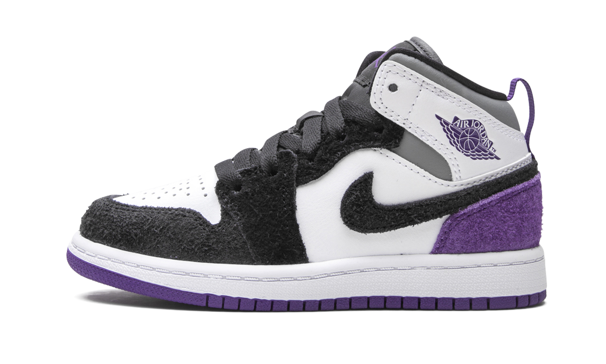 The Air Jordan 1 Mid SE PS “Purple Suedeâ€?is the preschool sizing of Michael Jordan's first signature shoe in a colorway that combines different materials and colors to tell its story. The “Purple Suedeâ€?makeup of the alternate mid-top Jordan 1 sports a regal hue of purple suede paneling on the heel that contrasts the smooth white leather found on the collar. mid-panel. and toe. The same hairy suede fabric can be found on the Swoosh detailing on either side and on the forefoot. toe cap. and eyelets. Jordan Brand places a purple “Wingsâ€?emblem on the collar and purple Jumpman branding on the tongue tag of the black nylon tongue.