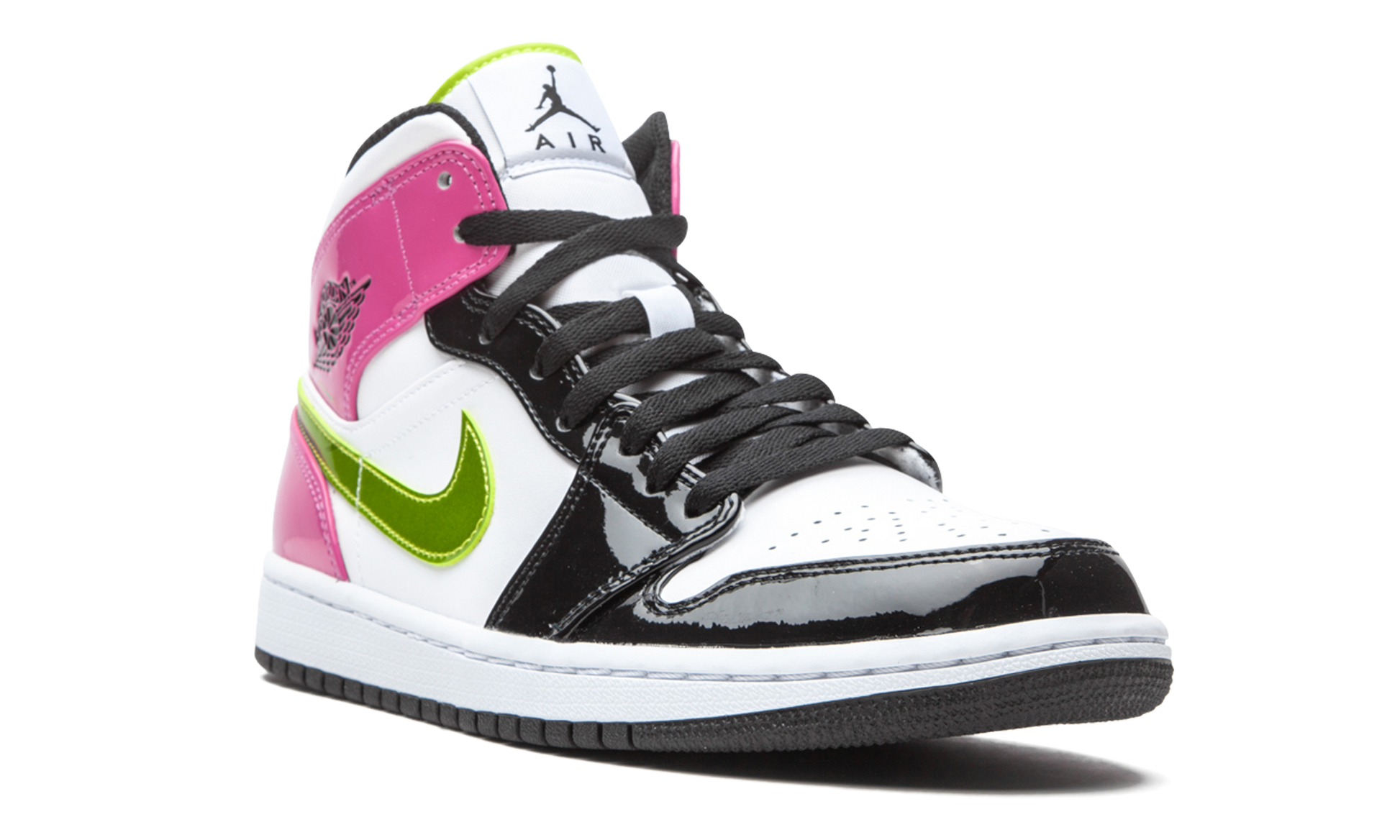 The Women's Air Jordan 1 Mid SE “Cyber/Active Fuchsiaâ€?is a vivacious colorway of Michael Jordan's first signature shoe in its mid-top silhouette. Fitted in women's sizing. the “Cyber/Active Fuchsiaâ€?Jordan 1 Mid evokes summer's casual and carefree vibes thanks to its eccentric design that combines materials. textures. and colors in a unique new way. Glossy black patent leather overlays appear on the forefoot. toe cap. and eyelets. The same premium patent leather detailing is used again on the Active Fuchsia collar and heel overlays. A variety of smooth white leather forms the base of the upper. Elsewhere. a dark neon green patent leather Swoosh logo can be found on each lateral side while blue Swooshes are present on the medial sides. A black leather “Wingsâ€?emblem is located on the collar. Other details include a white nylon tongue with green accenting on the top. a black Jumpman on the tonal nylon tongue tag. and a black liner. The white rubber outsole and black outsole finish off the look of this casual lifestyle look for the Women's Air Jordan 1 Mid.
