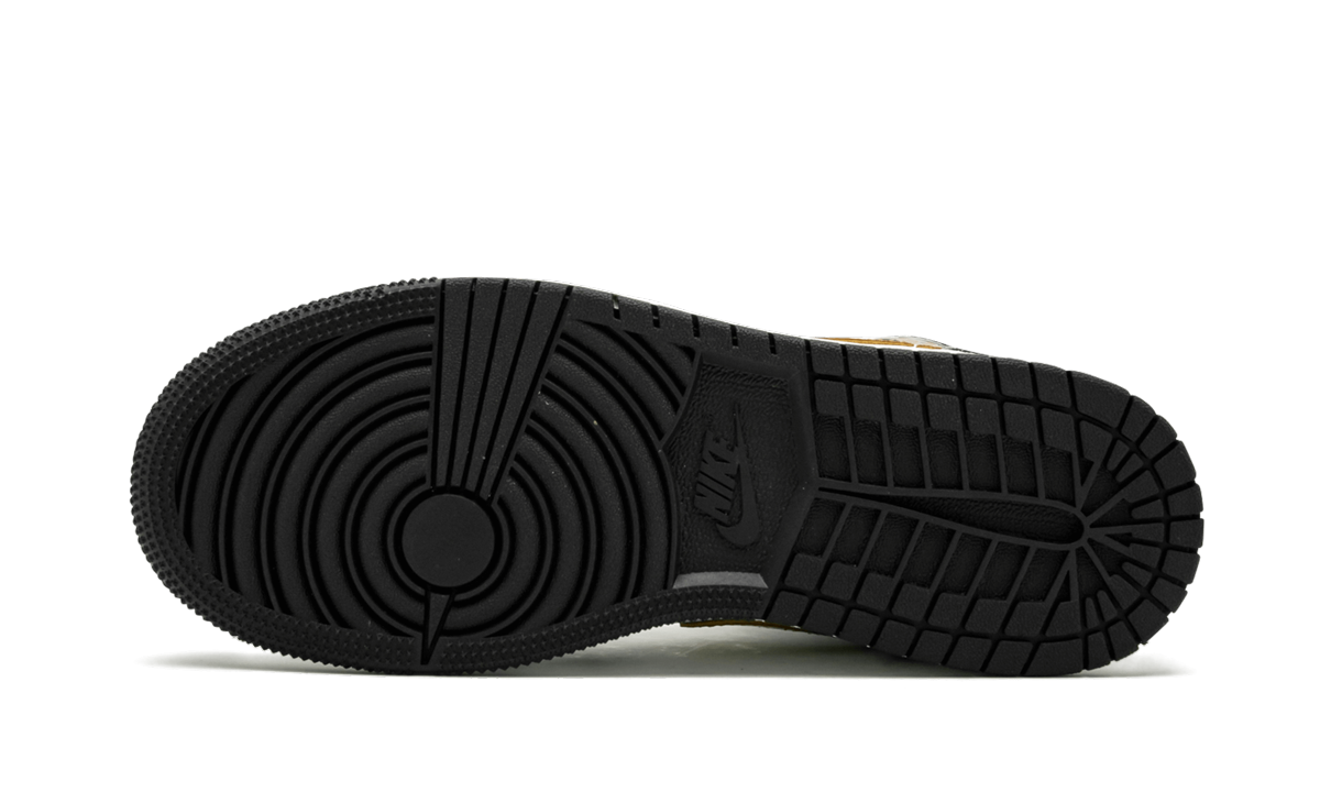 The grade school release of the Air Jordan 1 Mid is outfitted in a clean white. black. and gold color scheme. A white leather upper is given premium accents like black patent leather overlays. and a glossy gold Swoosh. Shiny gold hits also accentuate the Jumpman logo on each tongue and the Wings logo on each ankle.