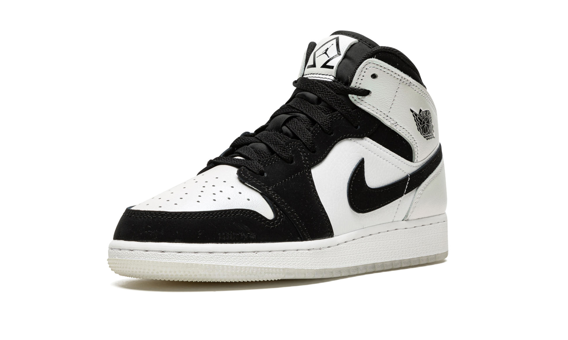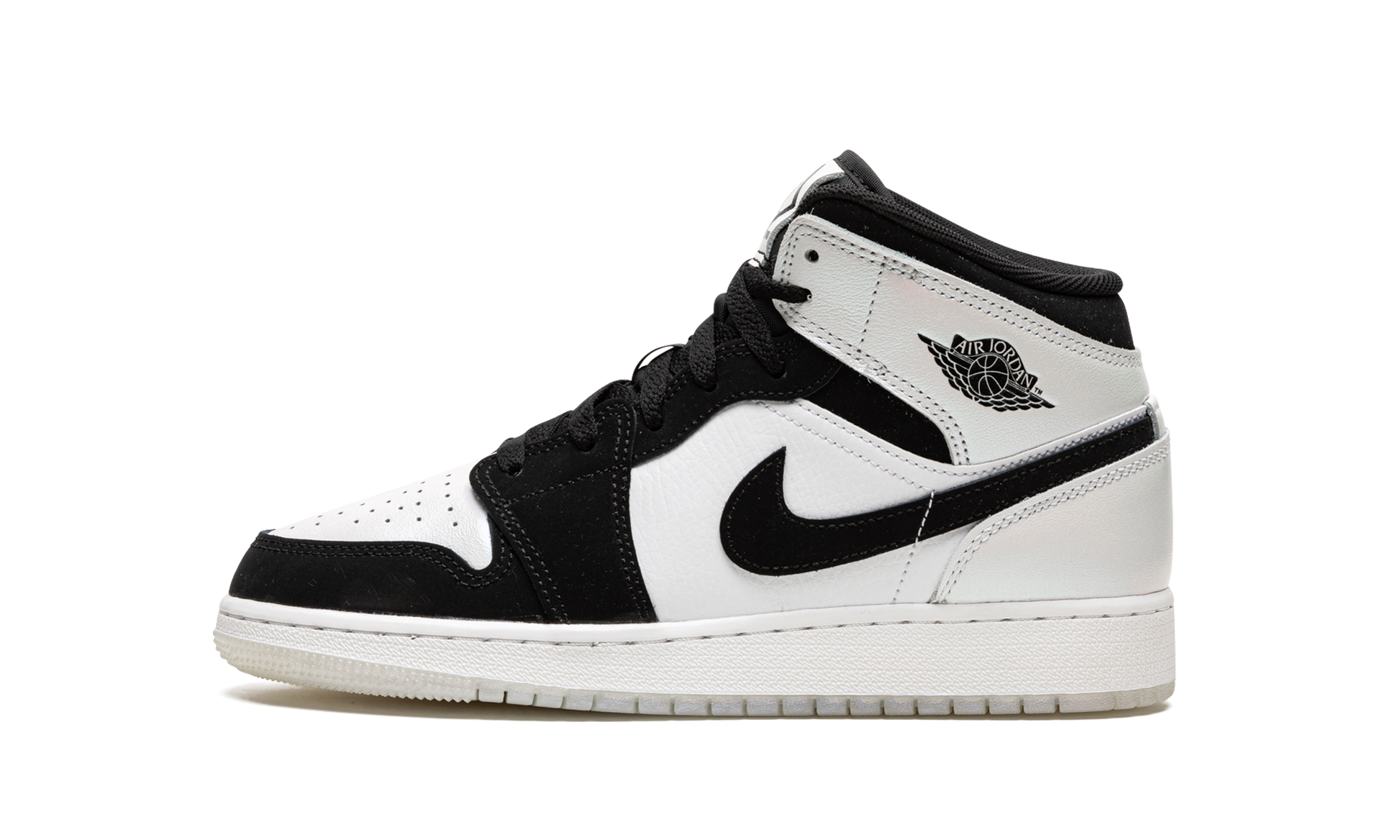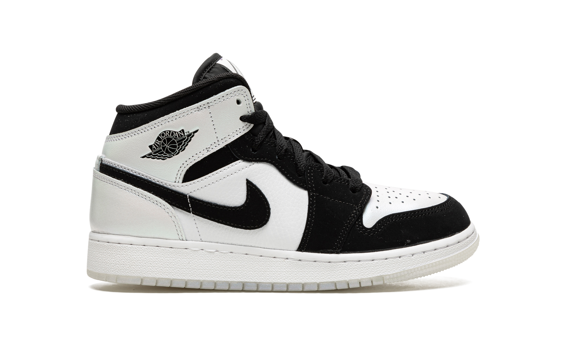 The Air Jordan 1 Mid GS “Diamond Shortsâ€?is the youth sizing of the colorway inspired by Air Jordan diamond basketball shorts. In addition to appearing on the Jordan 1 Mid. the “Diamondâ€?style also appeared on the Jordan 1 Low. As for this shoe. it features a black synthetic nubuck toe cap. forefoot. eyelets. mid-panel. and collar. The perforated toe. mid-panel. collar. and heel are designed in white leather. A black “Wingsâ€?logo is embroidered on the back of the shoe. The unique “diamondâ€?logo found on the tongue tag mimics the design of the same detailing found on the sides of Jordan Brand's mesh basketball shorts. which are inspired by classic Chicago Bulls shorts. A white rubber midsole and milky translucent outsole complete the look.