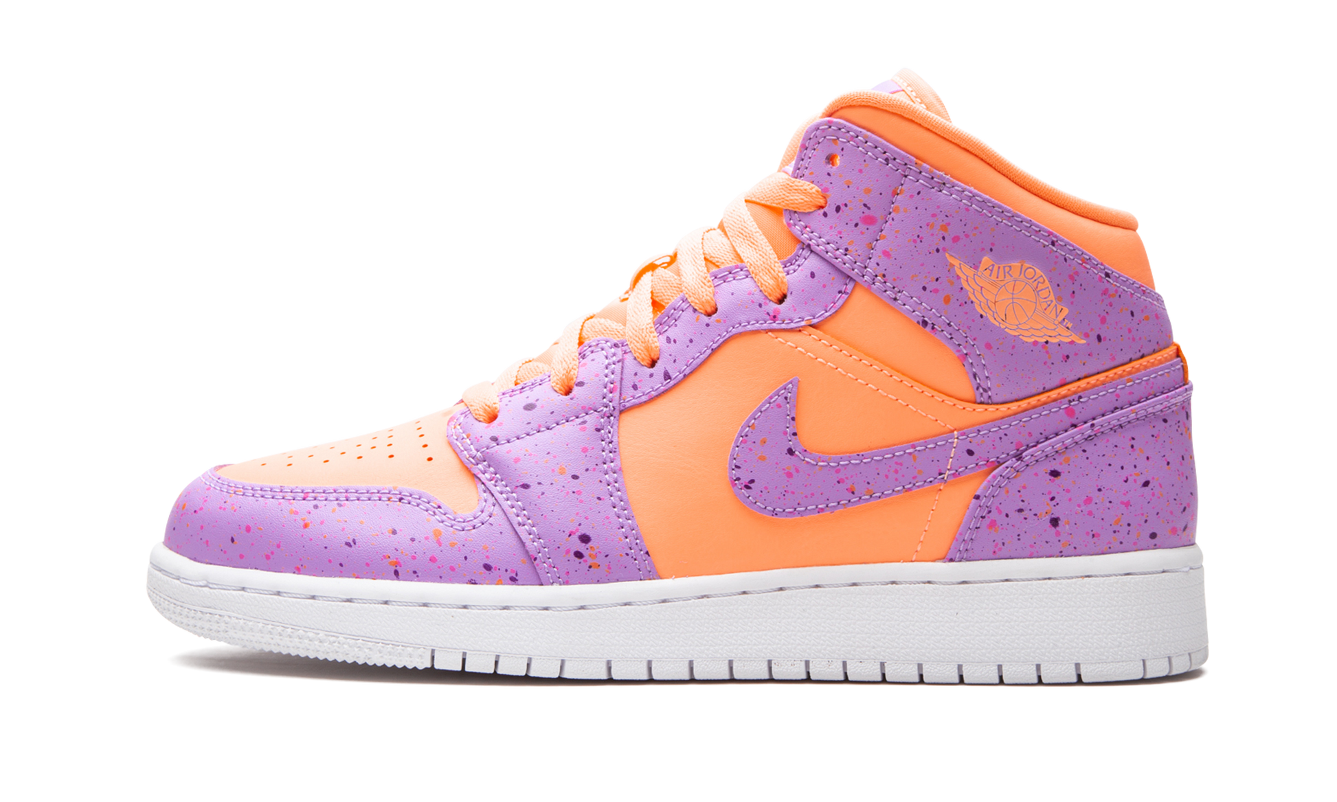 The Air Jordan 1 Mid SE GS “Orange Pulse/Atomic Violetâ€?is a kids edition of Michael Jordan's first signature shoe in an extra colorful look. Appearing in the popular mid-top height. the “Orange Pulse/Atomic Violetâ€?colorway of the Jordan 1 Mid for kids is an explosion of color. Speckled Atomic Violet synthetic leather overlays appear on the forefoot. eyelets. collar. and heel for a bold new look for the Jordan 1 Mid. Elsewhere. smooth orange synthetic leather is located on the perforated toe. mid-panel. and collar. The same shade of orange appears on the “Wingsâ€?branding on the collar. laces. and nylon tongue. A speckled purple Swoosh can be found on either side and a purple tongue tag with white Jumpman branding is stitched onto the tongue.