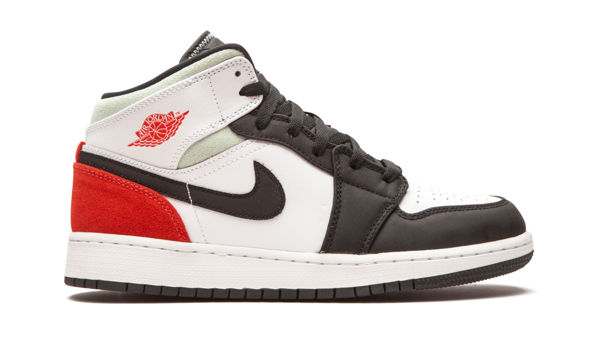 The Air Jordan 1 Mid GS “Red/Grey/Black Toeâ€?is the youth sizing of Michael Jordan's iconic first signature shoe in the desirable mid-top silhouette inspired by an original colorway. The “Red/Grey/Black Toeâ€?is loosely based on the “Black Toe.â€?a look cooked up by Nike and worn by Jordan all the way back in 1985. As for this design. smooth white leather is located on the perforated toe. mid-panel. and collar. Black nylon overlays on the forefoot and eyelets are a subtle nod to the “OGâ€?design. Elsewhere. grey suede is underlaid on the collar and a black leather Swoosh graces the mid-panel. Track Red suede covers the heel and is used on the “Wingsâ€?insignia on the collar.