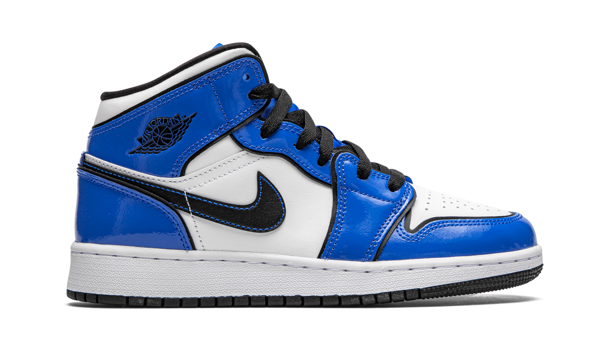 The Air Jordan 1 Mid GS “Signal Blueâ€?is the youth sizing of Michael Jordan's first signature shoe in an Orlando Magic inspired colorway for kids. The Air Jordan 1 Mid is as popular as it's ever been in recent years due to refreshing looks like the “Signal Blueâ€?that add to the iconic silhouette's story. Jordan Brand adds shining patent leather overlays in the shade of royal blue to the forefoot. eyelets. collar. and heel. The same hue of blue also appears on the tongue and nylon tongue tag with black Jumpman branding. Blue contrast stitching borders the black leather Swoosh and a black “Wingsâ€?insignia is located on the collar. The perforated toe. mid-panel. and collar are finished off in white leather to complete the look.