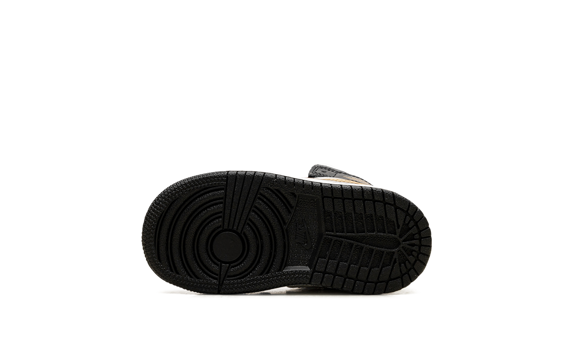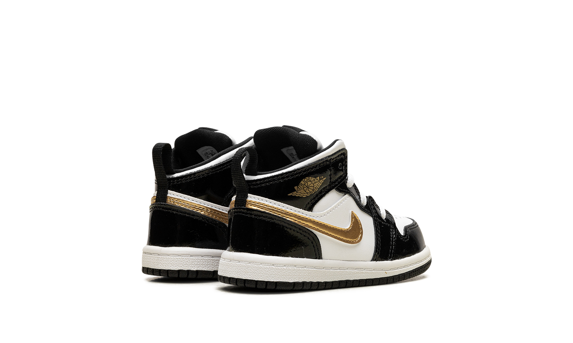 The Air Jordan 1 Mid Patent "Black Gold'' takes inspiration from the classic style of the OG Air Jordan 1. Presented in January 2019. this toddler style was made to stand out with a black and white leather upper and shimmering gold Swoosh and Wings branding. The padded mid-top collar gives a layer of comfort. and the polyurethane midsole and rubber outsole are added for the best tread on and off the playground.
