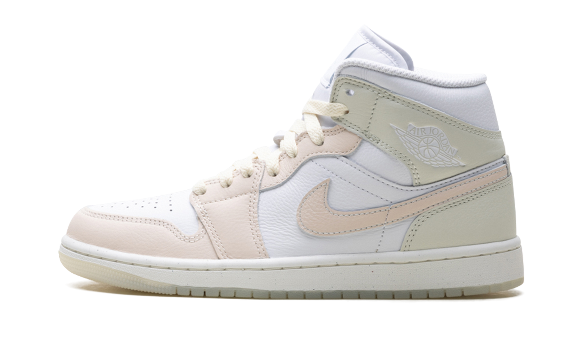 Step up your game with the Air Jordan 1 Mid SE "White Sea Glass." This Special Edition refresh of the classic silhouette blends premium genuine leather and velvety nubuck for a sophisticated look. Featuring a clean White base complemented by soft Sea Glass and Guava Ice accents. it delivers a uniquely elegant style. Signature Air-Sole cushioning in the heel provides all-day comfort. finished with a metal Wings logo for a truly premium feel.