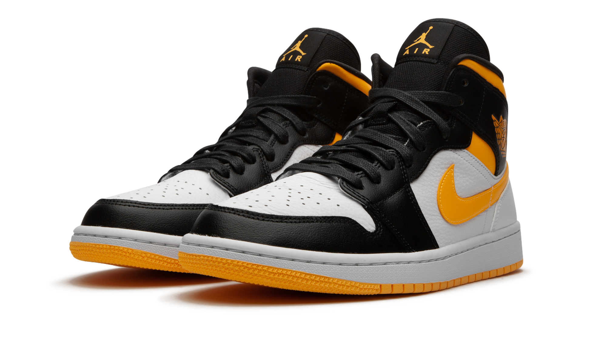 The Women's Air Jordan 1 Mid “Laser Orange/Blackâ€?displays a fresh new look that fits within the confines of Jordan Brand's lifestyle-oriented lineup. This women's sizing of the Jordan 1 Mid features an attention-seeking color scheme that leans heavily on its Laser Orange collar. leather Swooshes. and “Wingsâ€?logos. White tumbled leather can be found on the mid-panel. perforated toe. and heel. Glossy black laces and black leather overlays on the forefoot. eyelets. and collar give this colorway a luxurious appeal. The black mesh tongue displays orange Jumpman accenting.