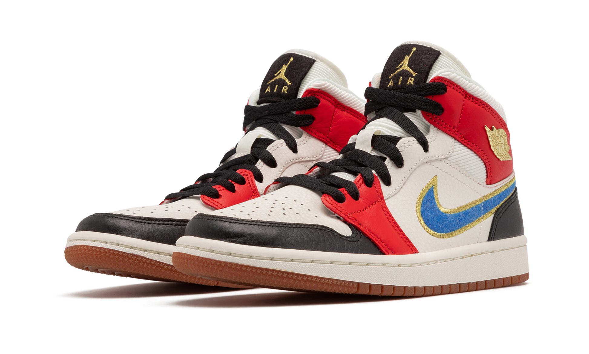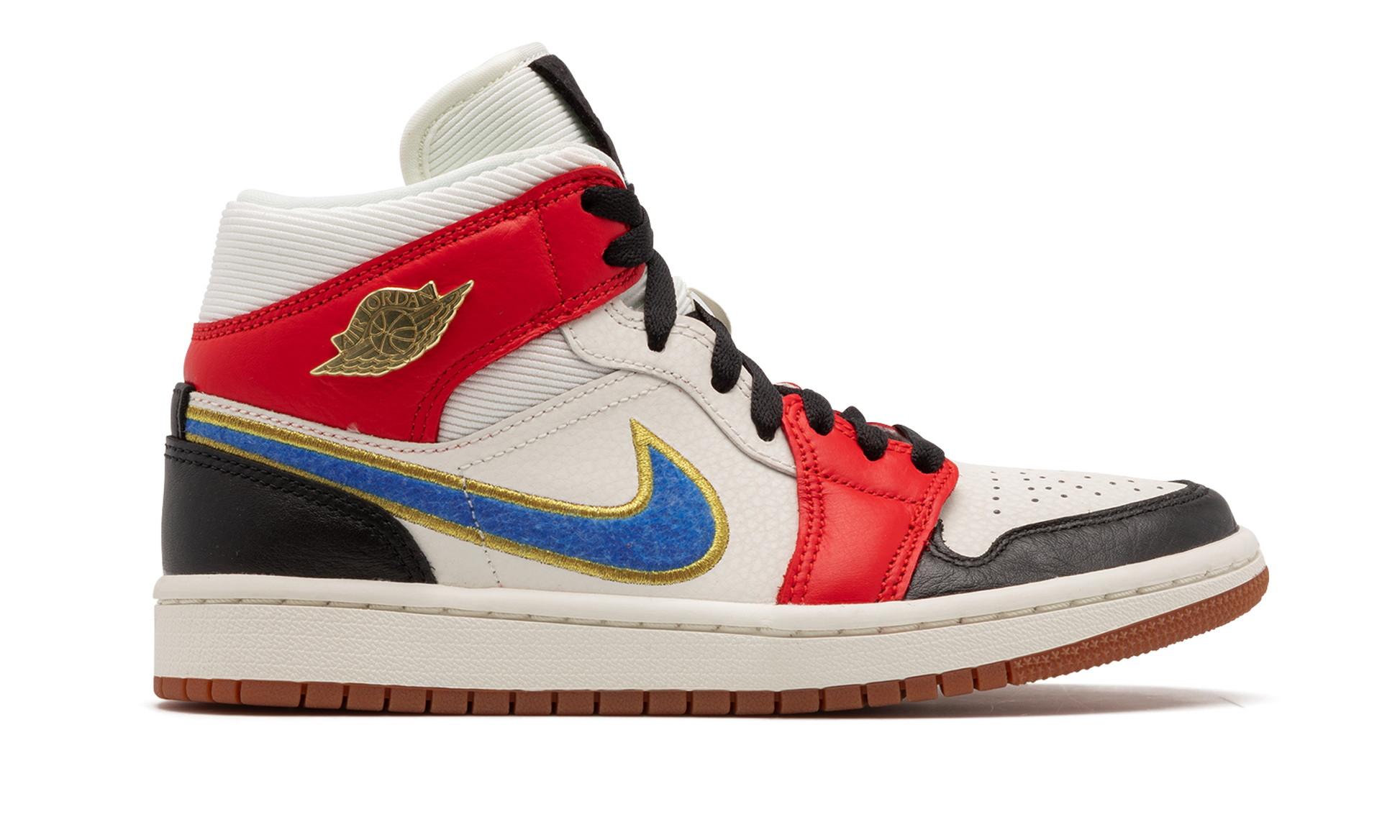 The Women's Air Jordan 1 Mid SE “Let(Her)manâ€?is a women's exclusive release of Michael Jordan's first signature shoe in a colorway inspired by the Jordan Wings scholarship program. Moreover. the “Let(Her)manâ€?is a play on the word “lettermanâ€?and its design is influenced by the varsity jackets worn across college campuses. Details include Sail leather on the perforated toe. mid-panel. and middle eyelet overlay. The same hue of cream is applied to the corduroy detailing on the collar and tongue. Both the toe cap and heel feature black leather overlays. Contrasting fiery Chile Red leather overlays can be found on the forefoot and collar. Branding appears in the form of a light blue felt Swoosh with gold outlining on the mid-panel and gold “Wingsâ€?emblem on the collar. The same fuzzy material used on the side Swoosh appears on the black tongue tag with gold Jumpman detailing. A cream colored midsole provides an infusion of nostalgic vibes. Release date: November 20. 2020.
