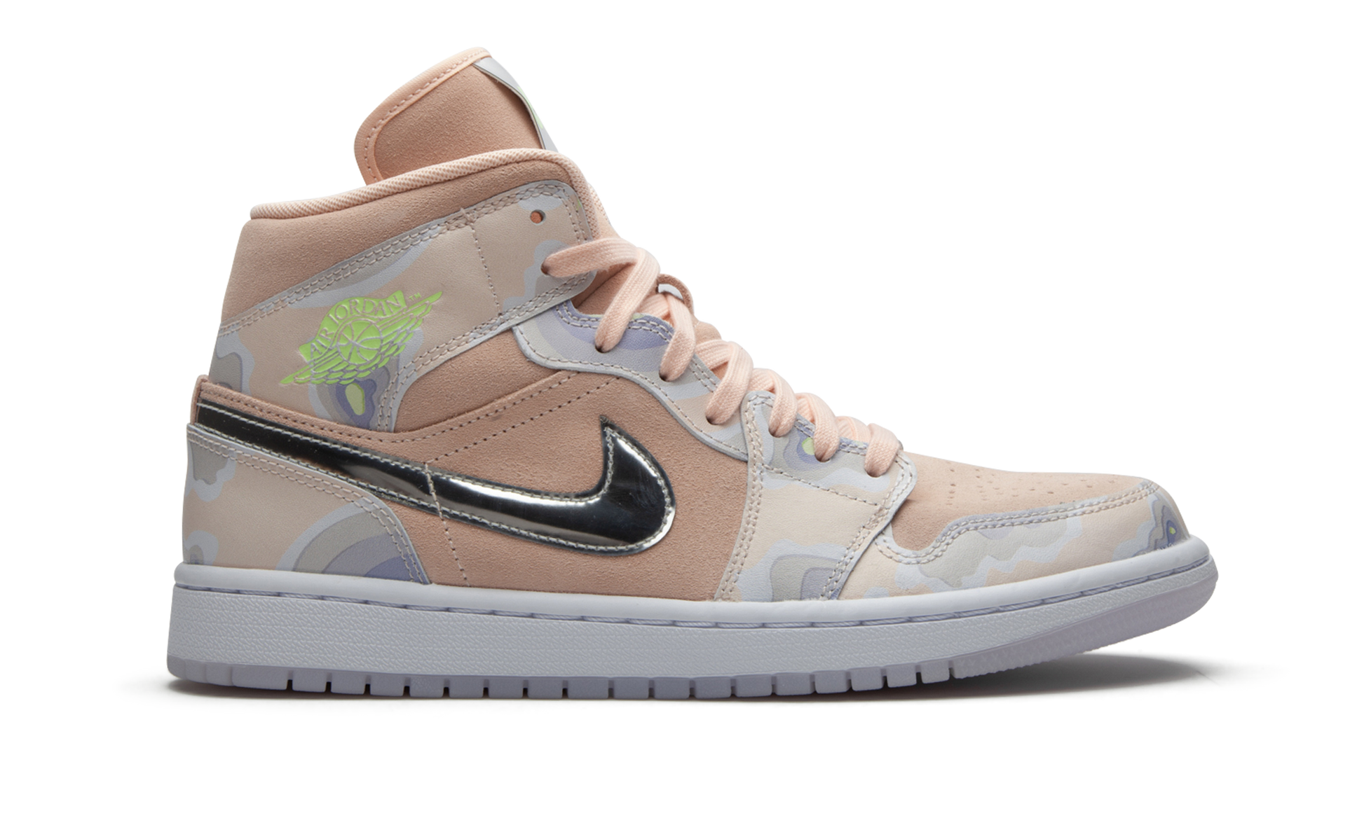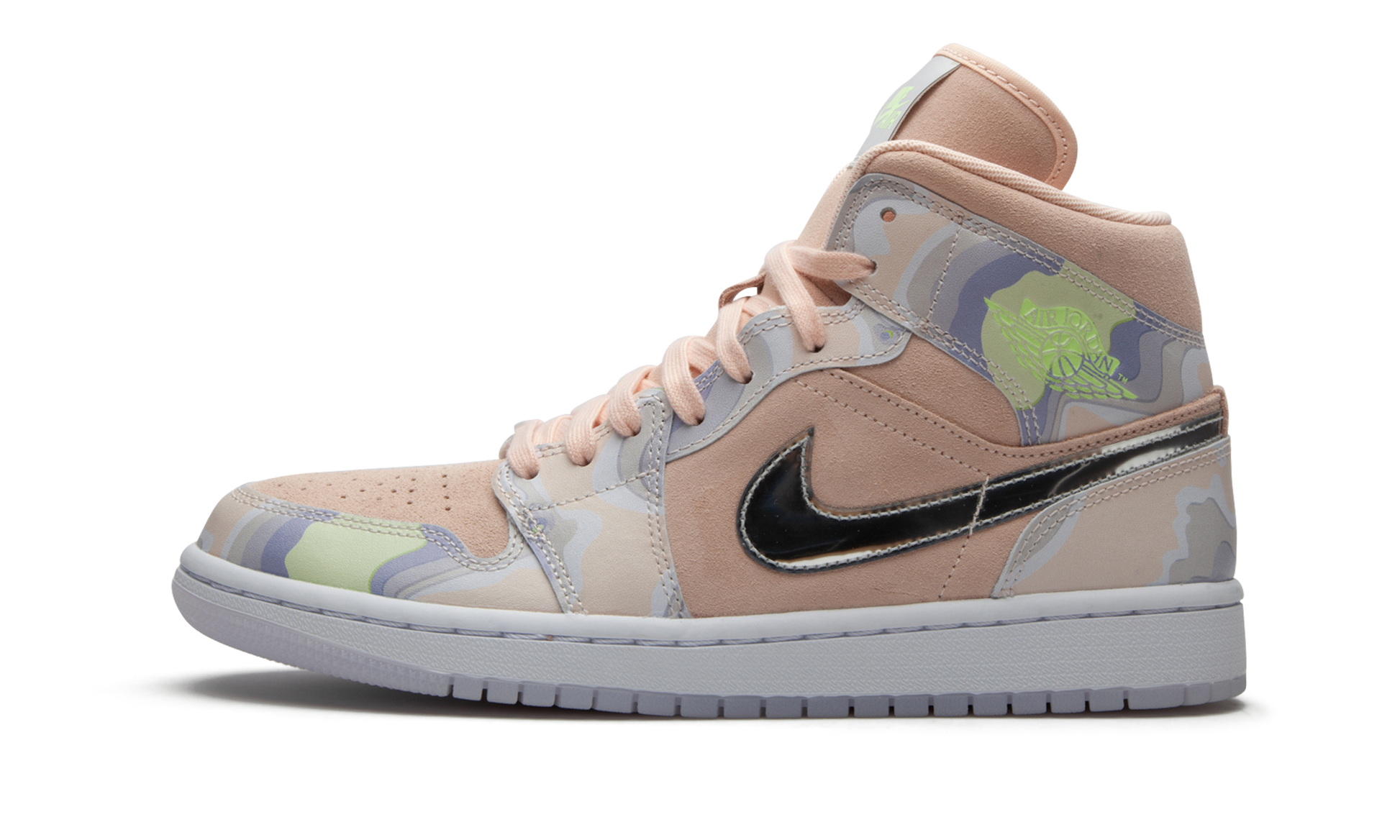 The Women's Air Jordan 1 Mid “P(Her)spectiveâ€?is a unique colorway of Michael Jordan's first signature shoe in mid-top form. This unique P(Her)spective design features pastel hues for an off-the-court appeal. Washed Coral suede forms the base of the upper. appearing on the perforated toe. mid-panel. and collar. Contrasting nubuck overlays on the forefoot. collar. and heel display soothing hues of green and blue. Branding appears in the form of Silver Metallic Swooshes on the mid-panel. neon green “Wingsâ€?detailing on the collar. and chrome “Nike Airâ€?patches on the tongue. The Women's Air Jordan 1 Mid “P(Her)spectiveâ€?was released on June 20. 2020.