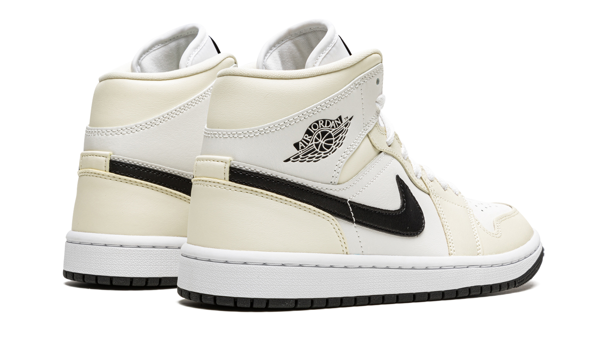 The Women's Air Jordan 1 Mid “Coconut Milk" is a versatile colorway of Michael Jordan's first signature shoe in the popular mid-top height for women. An everyday option. the “Coconut Milkâ€?Jordan 1 Mid's perforated toe. mid-panel. and collar are designed in white leather. A low-contrast shade of Coconut Milk-colored leather is found on the toe cap. forefoot. eyelets. collar. and heel. Both the leather Swoosh on the sides and the “Wingsâ€?logo on the collar appear in black leather. A black Jumpman with “Airâ€?branding is found on the white nylon tongue tag on the white nylon tongue.