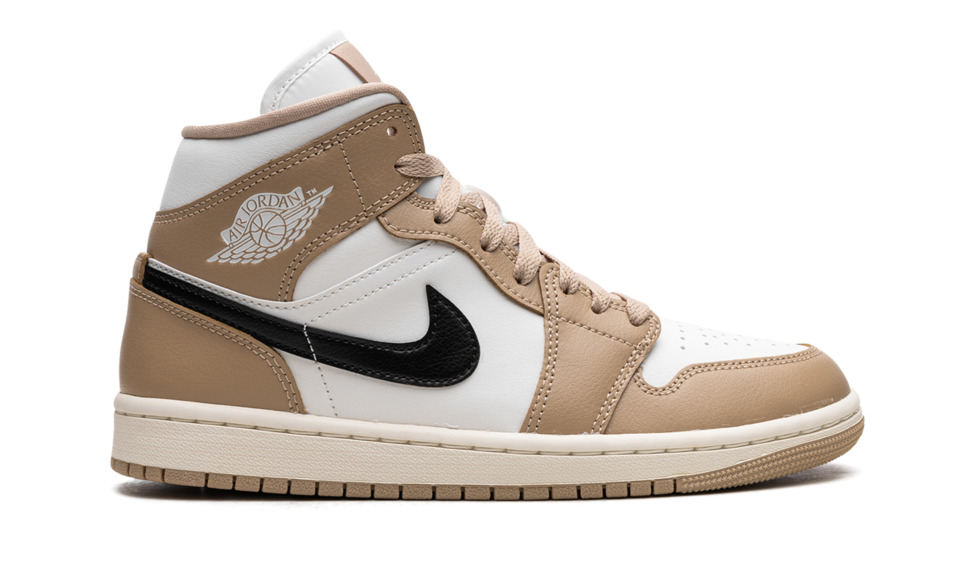 The Women's Air Jordan 1 Mid "Desert" is a women's-exclusive colorway of the casual sneaker with a versatile. earth-toned color palette. The upper features a Sail leather base that's contrasted with Desert. or tan. leather overlay panels on the toe cap. forefoot. eyelets. collar. and heel. A black leather Swoosh can be seen on each side. More classic Air Jordan branding appears on the shoe. with a “Wingsâ€?logo residing on the collar and a Jumpman logo dotting the tongue. A cream-colored rubber midsole and tan rubber outsole complete the look. Release date: October 20. 2023