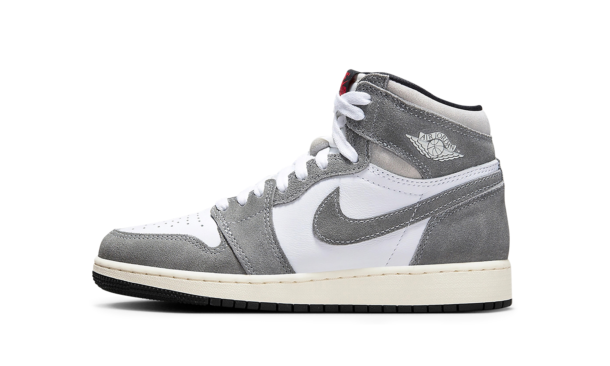 The Air Jordan 1 High OG GS “Washed Blackâ€?is the youth sizing of the retro basketball shoe with washed black suede overlays. The “Washed Blackâ€?Jordan 1 High OG is complete with a versatile look due to its white leather base and faded black suede overlays and Swoosh branding on the sides. A “Wingsâ€?logo appears on the collar and “Nike Airâ€?detailing is found on the tongue tag. The shoe's cream-colored midsole gives the design an aged. vintage look. Release date: June 10. 2023