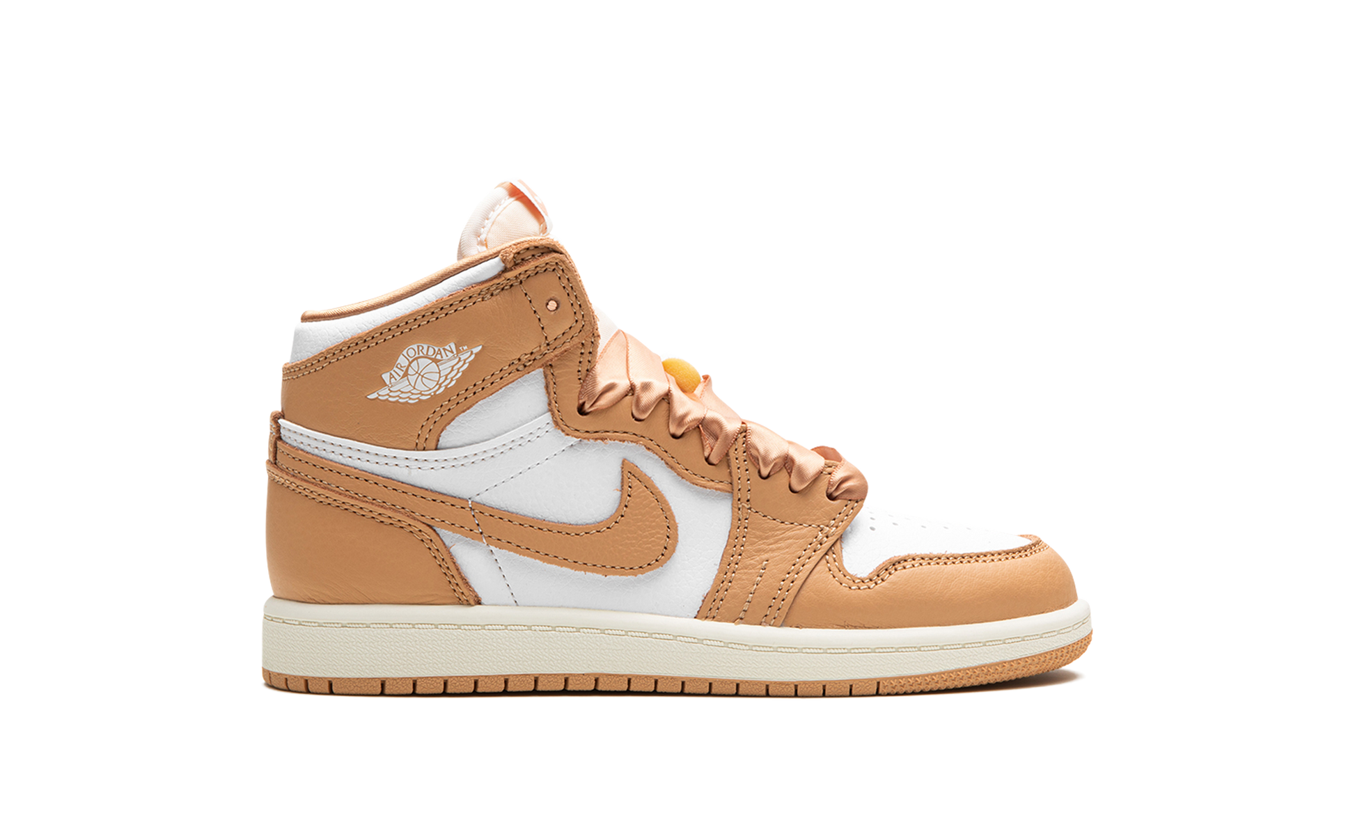 The Air Jordan 1 High OG PS "Praline" is the preschool sizing of the retro basketball shoe with a luxurious vibe. Released in women's sizing for adults. the “Pralineâ€?Jordan 1 High OG was also produced in children's sizes. The shoe's design features a white leather upper contrasted with Praline. or tan. leather overlays and a Praline leather Swoosh. Satin ribbon-style laces replace the Jordan 1's original laces for an opulent look. Other details include a white “Wingsâ€?logo on the collar and a Praline-colored Nike logo on the tongue tag. Underfoot. a cream rubber midsole and tan rubber outsole complete the look. Release date: September 13. 2023