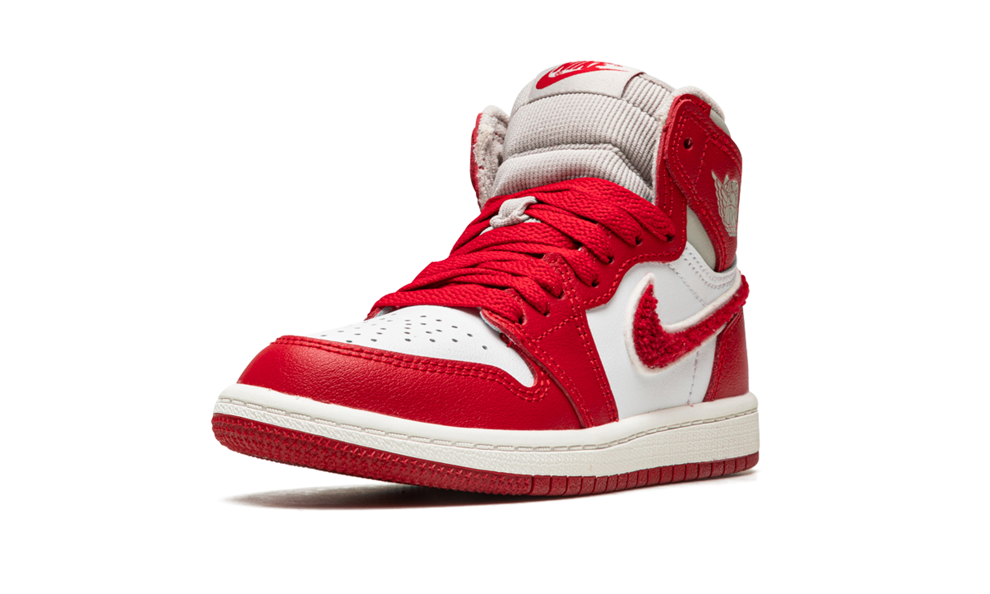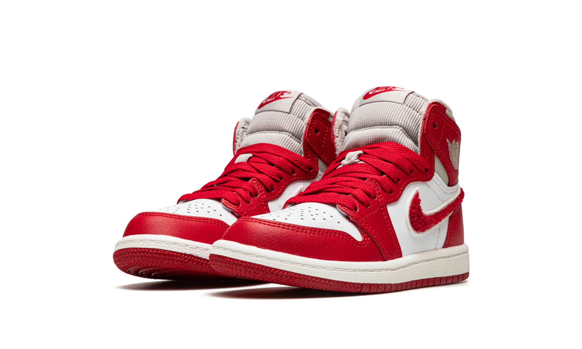 The Air Jordan 1 High OG PS “Varsity Redâ€?is the youth sizing of the retro basketball shoe with a premium build. Also known as the “Newstalgia.â€?this July 2022 release of Michael Jordan's first signature shoe looks to vintage varsity letterman jackets. specifically the chenille patches that are often found on their design. for inspiration. The shoe's perforated toe and mid-panel are designed in white leather. Contrasting Varsity Red leather appears on the overlay panels. The side Swooshes are designed in a fiery red chenille material. A light grey “Wingsâ€?logo appears on the collar. Additional design elements include a grey corduroy collar. red “Nike Airâ€?branding on the tongue tag. and red laces. Release date: July 20. 2022