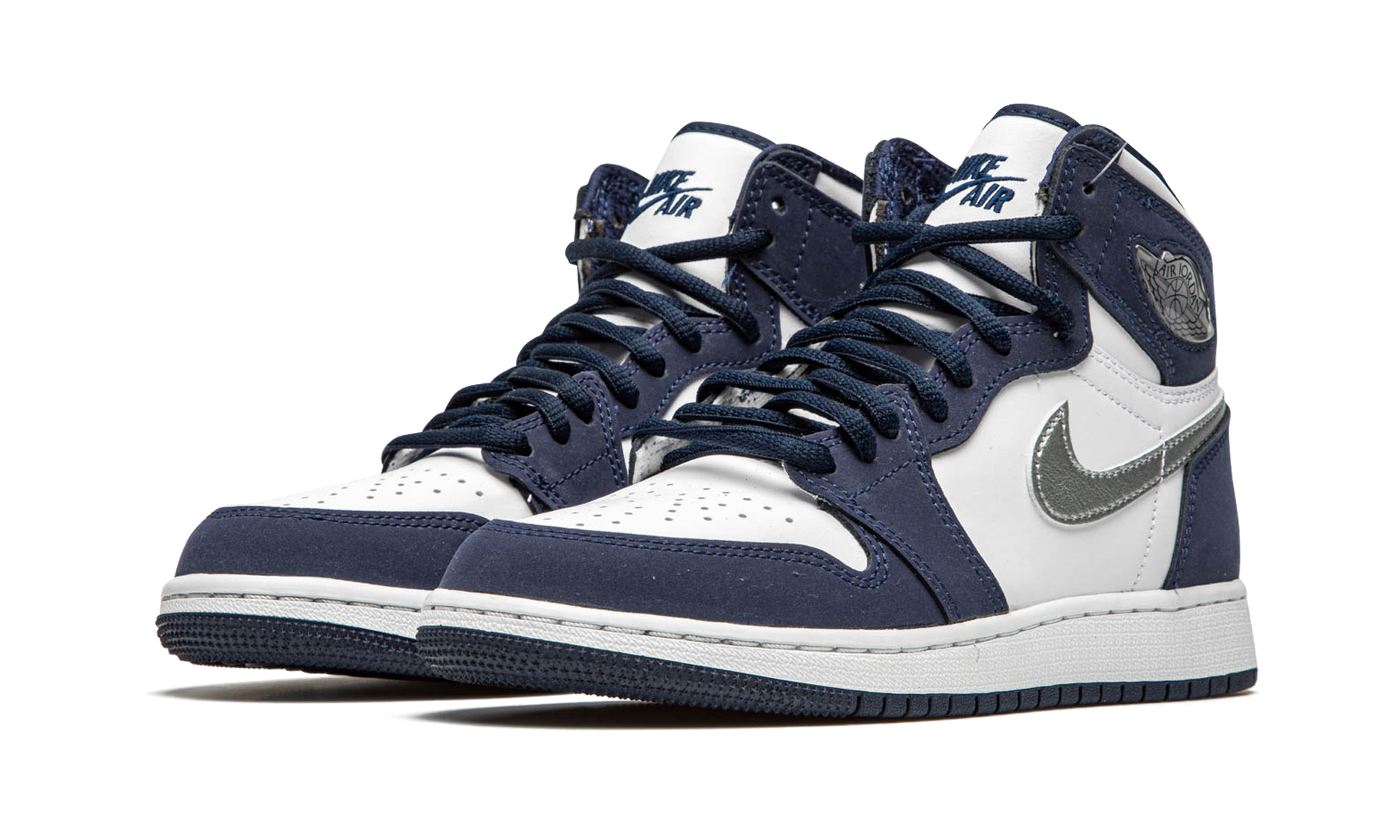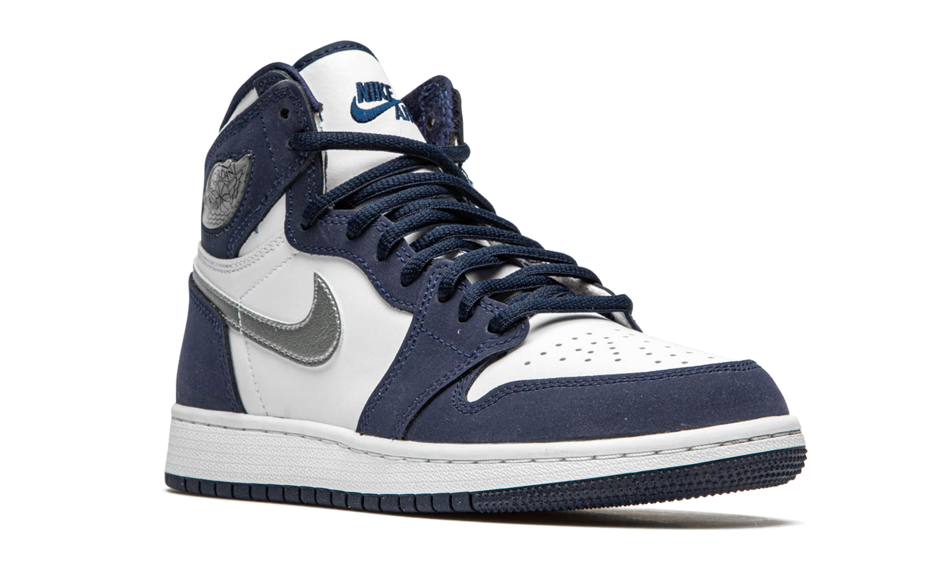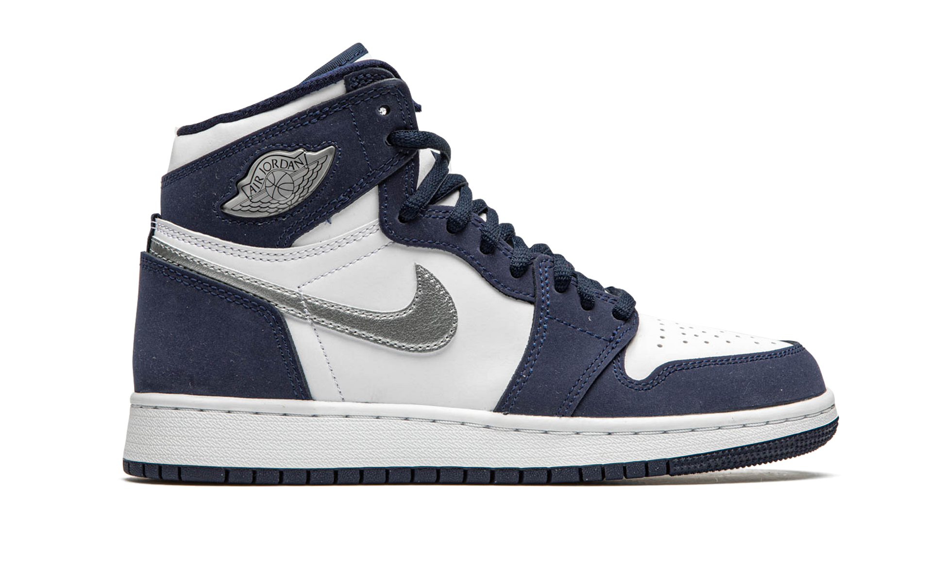 The Air Jordan 1 High Co.Jp GS “Midnight Navyâ€?is the youth sizing of the limited edition colorway of Michael Jordan's first signature shoe that originated in Nike's “Concept Japanâ€?collection. The global reissue of the “Midnight Navyâ€?Jordan 1 includes fitting the shoe in sizing options for the family. as evidenced by this design produced for children. Based on the original design from 2001. the modern version of the high-top shoe features the same white leather detailing on the perforated toe. mid-panel. and collar. Contrasting Midnight Navy overlays in a smooth nubuck material are located on the forefoot. eyelets. collar. and heel. A Metallic Silver Swoosh appears on either side of the shoe. The hue is used again on the “Wingsâ€?detailing found on the collar. A white leather tongue with “Nike Airâ€?embroidery completes the look of the Jordan 1 High Co.Jp GS “Midnight Navyâ€?in youth sizing. Release date: November 14. 2020.
