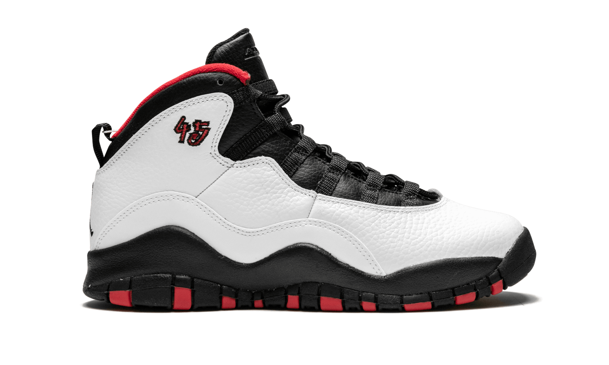 The first shoe Michael Jordan wore after his return to the NBA after his brief retirement. this is the Air Jordan 10 in its “Chicagoâ€?color scheme. Complete with his return uniform number 45 on the heels. this “Double Nickelâ€?version released in 2015 is inspired by his comeback 55-point performance at Madison Square Garden against the Knicks on March 28. 1995. This listing is for Grade School sizing only.