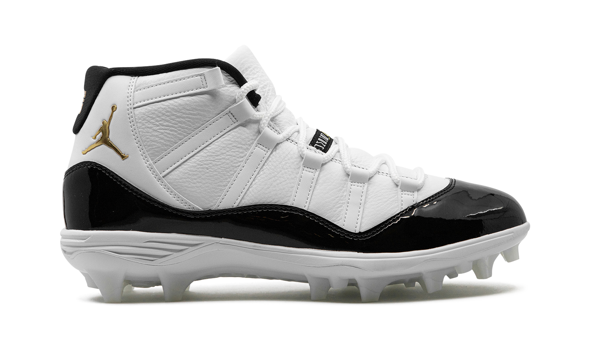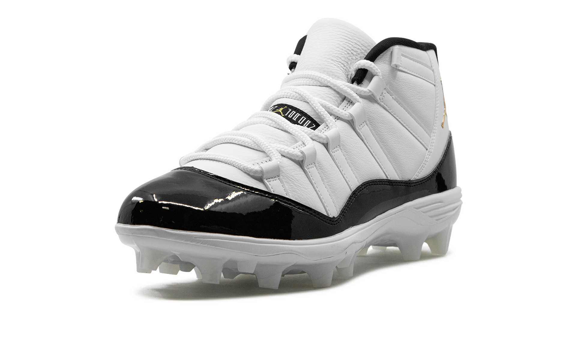 The Air Jordan 11 Cleats "Gratitude" is a modified baseball cleat version of the colorway of Michael Jordan's eleventh signature shoe that was originally released as part of the “Defining Moments Packâ€?from 2006. The Jordan 11 Cleats is an alternate version of the retro basketball shoe made for baseball. As for the “Gratitudeâ€?colorway. the design is based on the Jordan 11's original “Concordâ€?that was worn by Jordan with the Chicago Bulls throughout the team's historic run during the 1995-96 NBA season. The upper features a white leather construction and a glossy black patent leather mudguard. Metallic Gold Jumpman branding is found on the collar while “Jumpmanâ€?detailing appears across the white mesh tongue. Underfoot. the cleated sole provides traction on fields for ultimate performance capabilities.