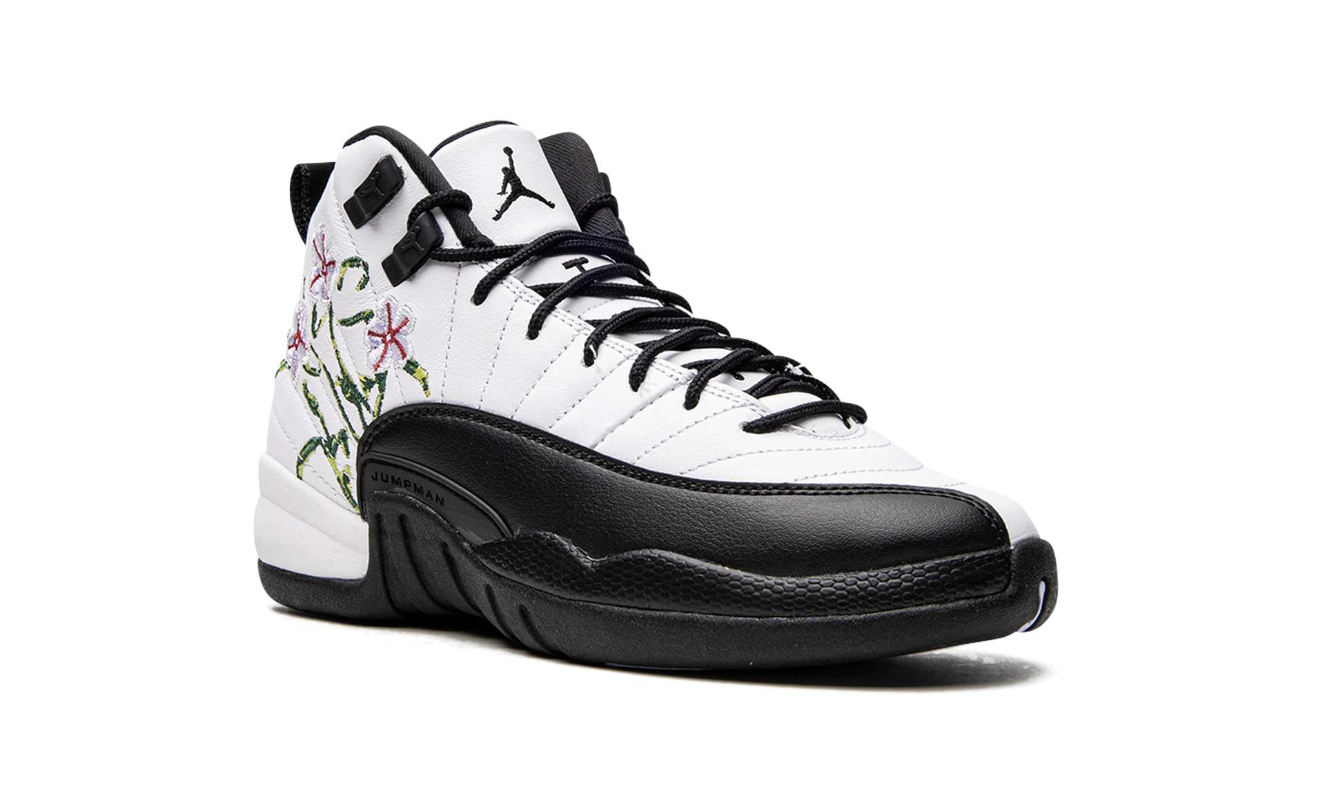 The Air Jordan 12 GS 'Floralâ€?is the youth sizing of the retro basketball shoe in a colorway with embroidered flower detailing on its design. The Jordan 12 GS “Floralâ€?updates Michael Jordan's twelfth signature shoe with a unique floral design while also referencing the model's original “Taxiâ€?colorway. The shoe features a white leather upper with a contrasting black synthetic mudguard on the toe and forefoot. A floral motif is embroidered on either side of the shoe. Black Jumpman and “Two 3â€?branding is found on the white leather tongue. A white Jumpman appears on the black rubber outsole. Release date: October 19. 2022