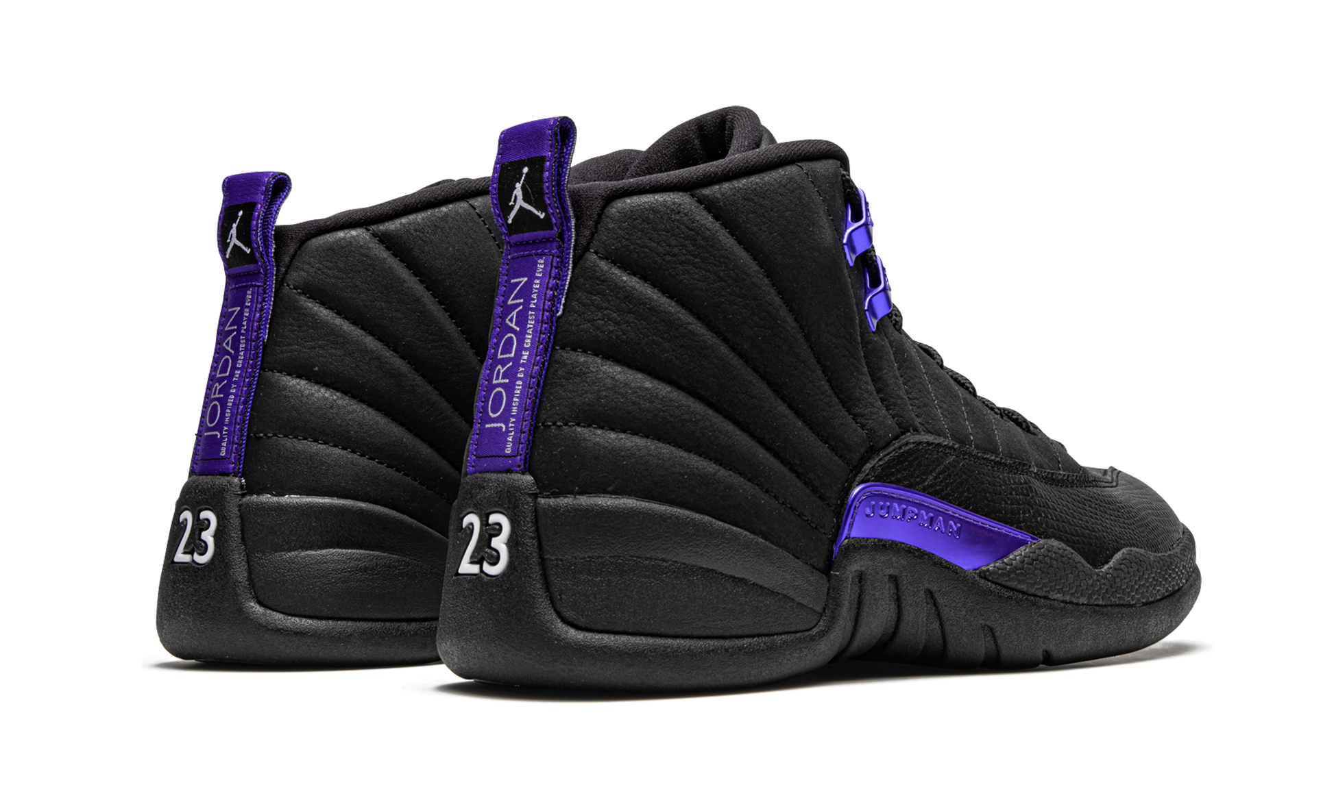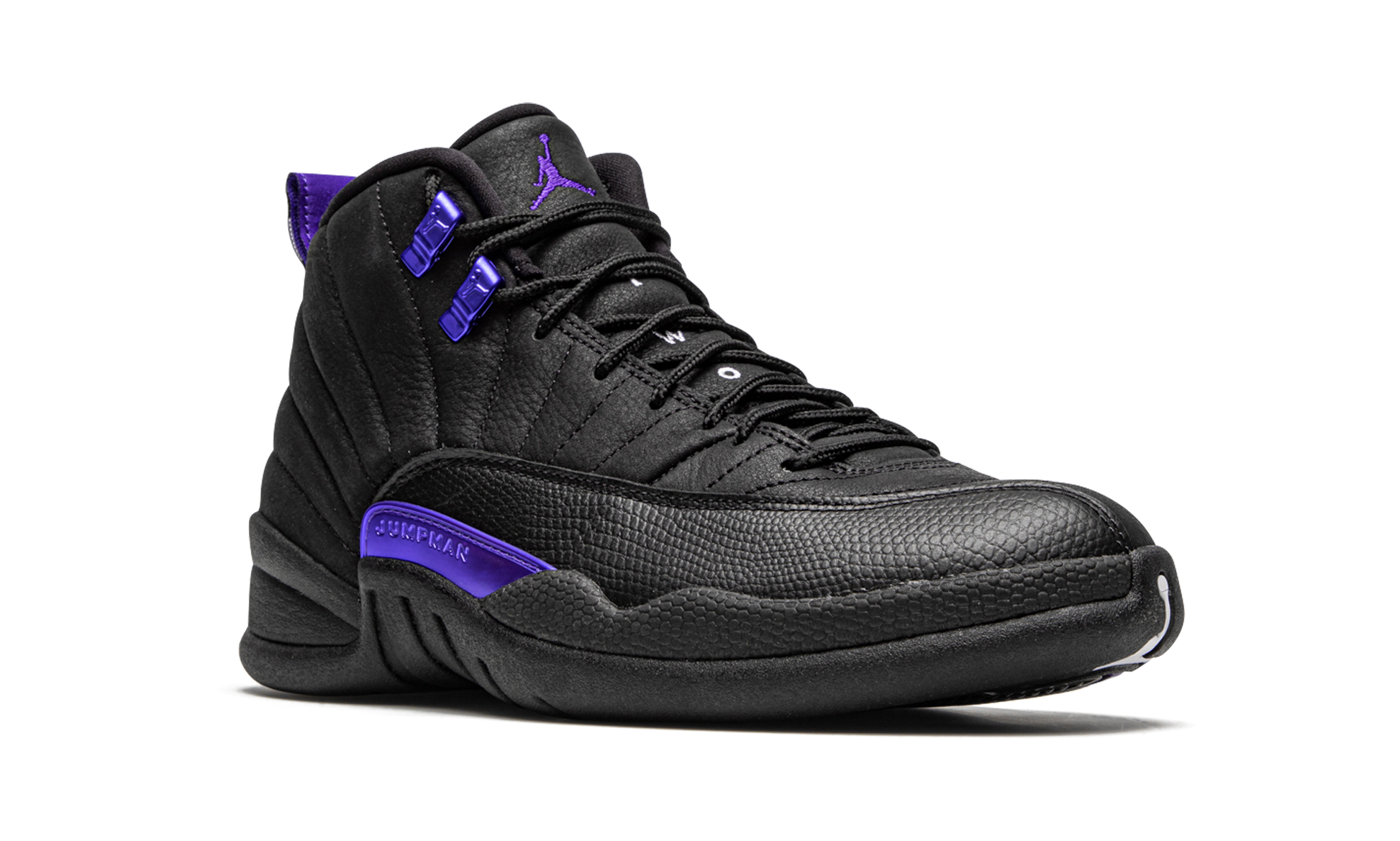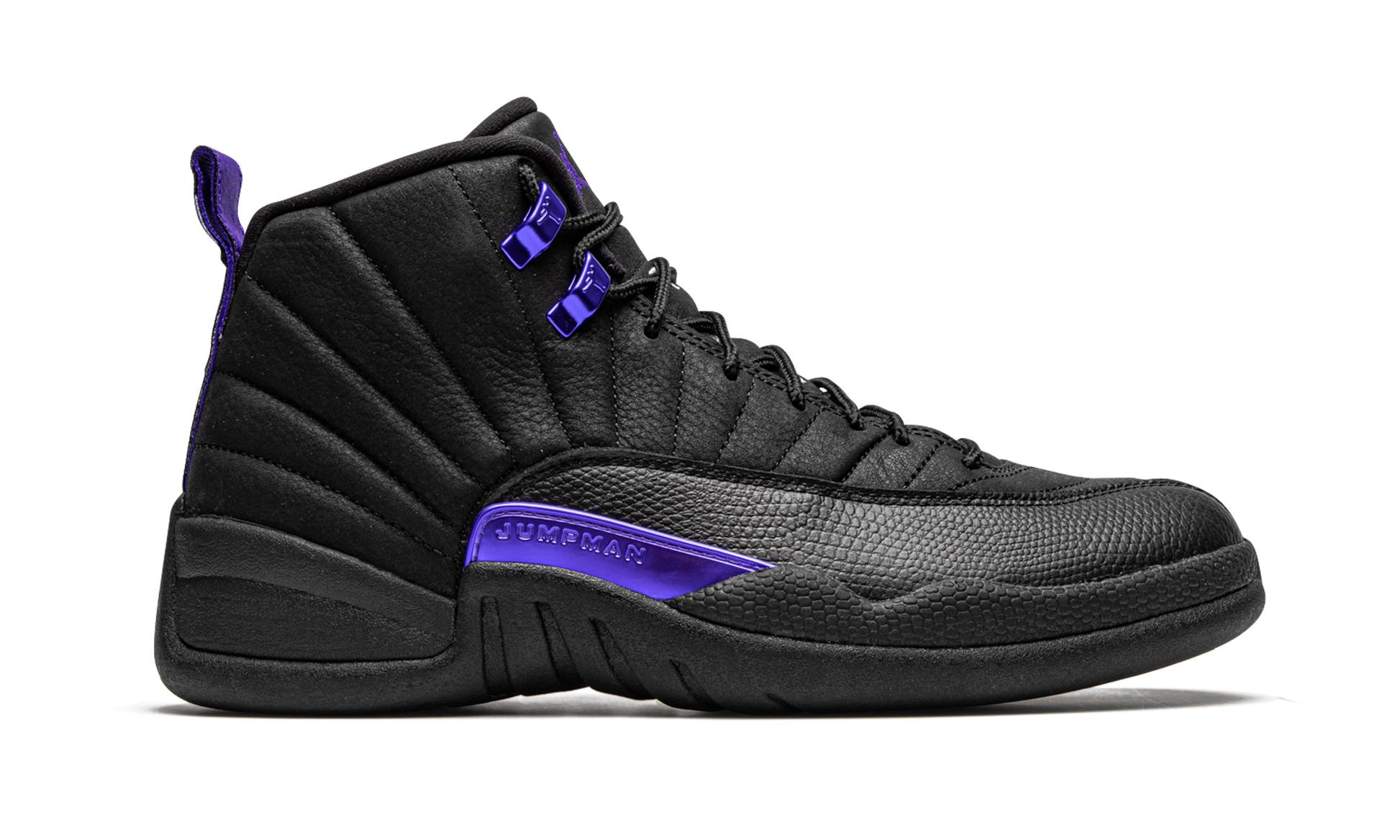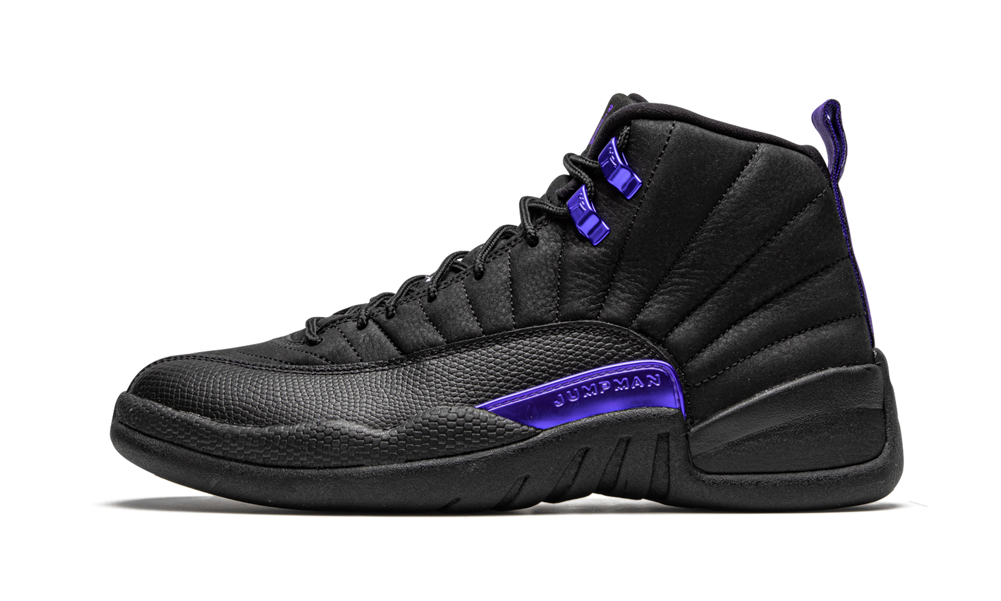 The Air Jordan 12 “Dark Concordâ€?is a colorway from Jordan Brand's Holiday 2020 release cycle that calls to mind classic player exclusive colorways from the 2000s. Although not officially associated with any player or team. the “Dark Concordâ€?Jordan 12 looks as if it could have been worn by Mike Bibby with the Sacramento Kings or even Kobe Bryant back in the day. The upper features a black nubuck construction with faux lizard leather print on the forefoot and mudguard. Dark Concord accented eyelets and Jumpman branding above the black rubber midsole breaks up the shadowy appearance of the shoe. Additional purple detailing can be found on the Jumpman embroidery on the tongue. and on the nylon patch located on the heel. White embroidered “Two 3â€?branding appears on the tongue. and white â€?3â€?detailing dots the back of the shoe. Release date: October 23. 2020.