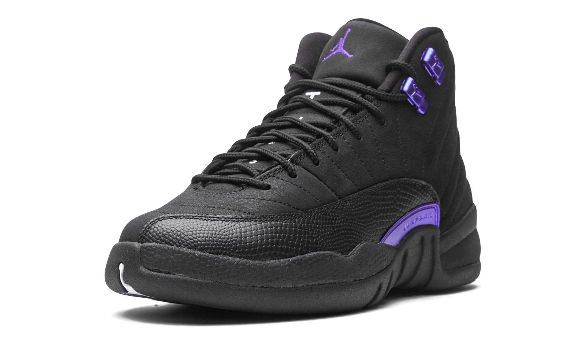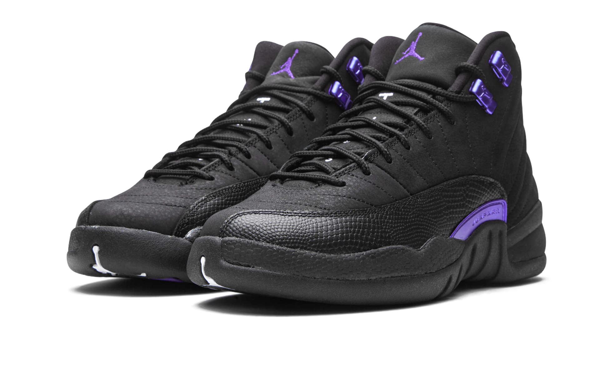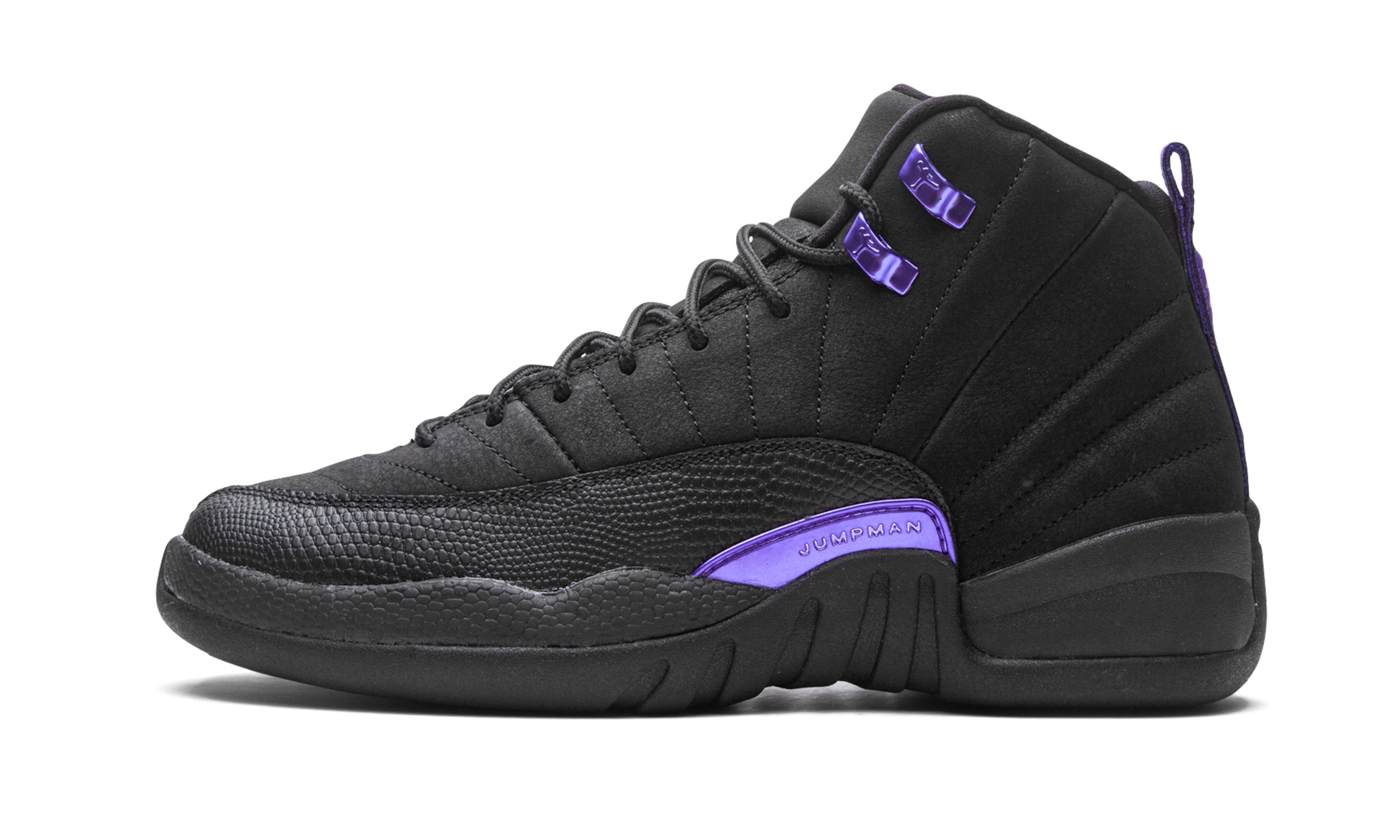 The Air Jordan 12 GS “Dark Concordâ€?is the youth sizing of Michael Jordan's twelfth signature shoe inspired by former Player Exclusive models. Although not officially associated with the Sacramento Kings or Los Angeles Lakers (or Phoenix Suns.) the “Dark Concordâ€?mirrors the many exclusive colorways worn by Team Jordan members Mike Bibby. Mitch Richmond. and even Kobe Bryant during his sneaker free agency tour of the early 2000s. The versatile “Dark Concordâ€?features a black synthetic nubuck material across the upper and a faux lizard skin material on the forefoot and toe. Metallic Dark Concord accenting can be found on the top lace eyelets. Jumpman plate above the midsole. and on the Jumpman embroidery on the black nubuck tongue. The word “Two 3â€?is embroidered in white text on the tongue. as well. A purple nylon overlay appears on the back of the shoe and features the classic “Quality Inspired by the Greatest Player Everâ€?branding per the original Air Jordan 12 design from the '90s. Release date: October 23. 2020.