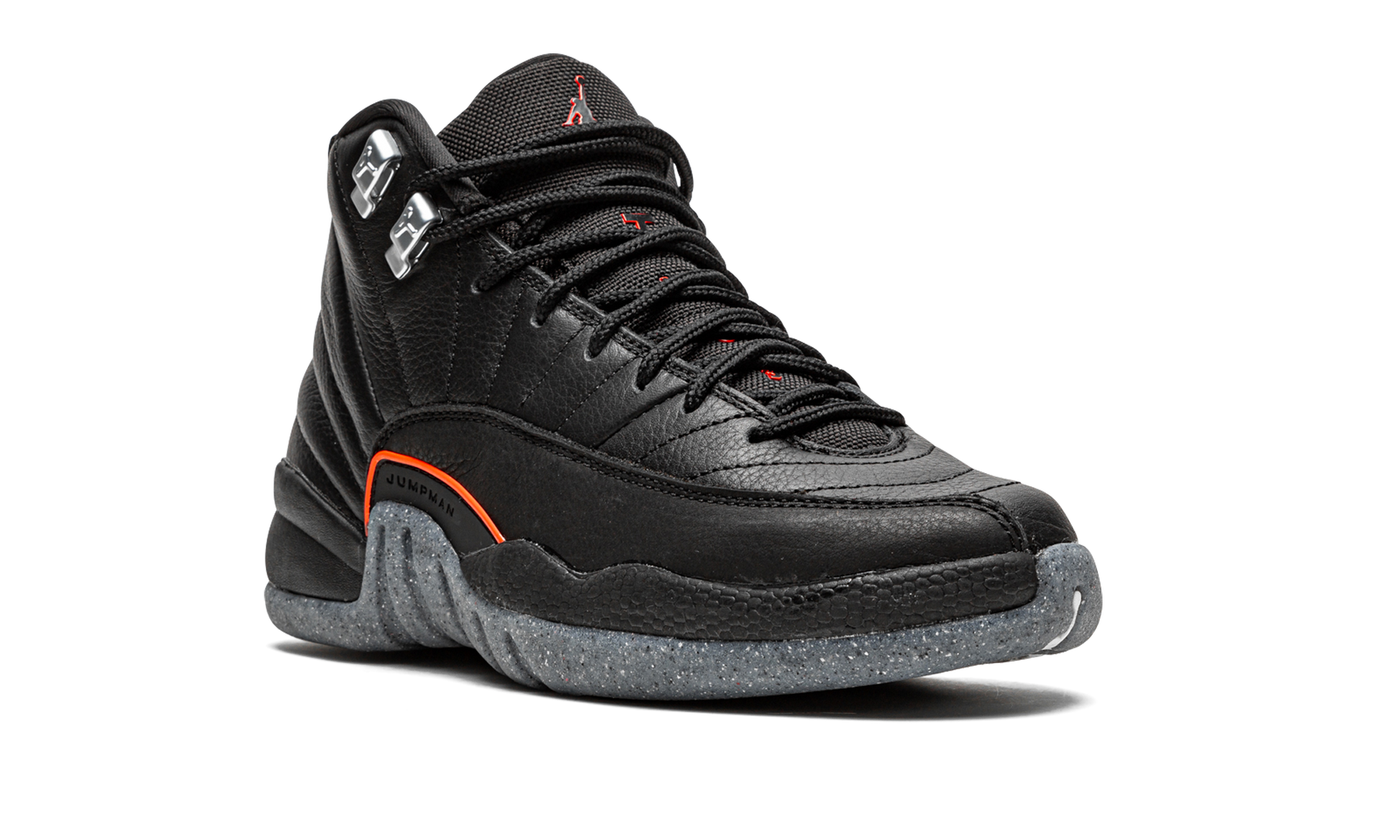The Air Jordan 12 GS “Utilityâ€?is the youth sizing of the modified version of the retro basketball shoe that recruits Nike's environmentally friendly “Grindâ€?material into the sole. An August 2021 release. the Jordan 12 “Utilityâ€?advances the design of Michael Jordan's twelfth signature shoe that once introduced Nike's Zoom Air technology into the Air Jordan line in 1997. Here. details include a black tumbled leather upper paired with a black synthetic nubuck mudguard. Red piping borders the “Jumpmanâ€?branding on the lateral side. The tongue appears in a rugged black ballistic mesh textile. Other details include a black painted midsole with a faux lizard skin finish and an outsole constructed from Nike's “Grindâ€?composition. which contains up to 3% recycled materials. Release date: August 21. 2021