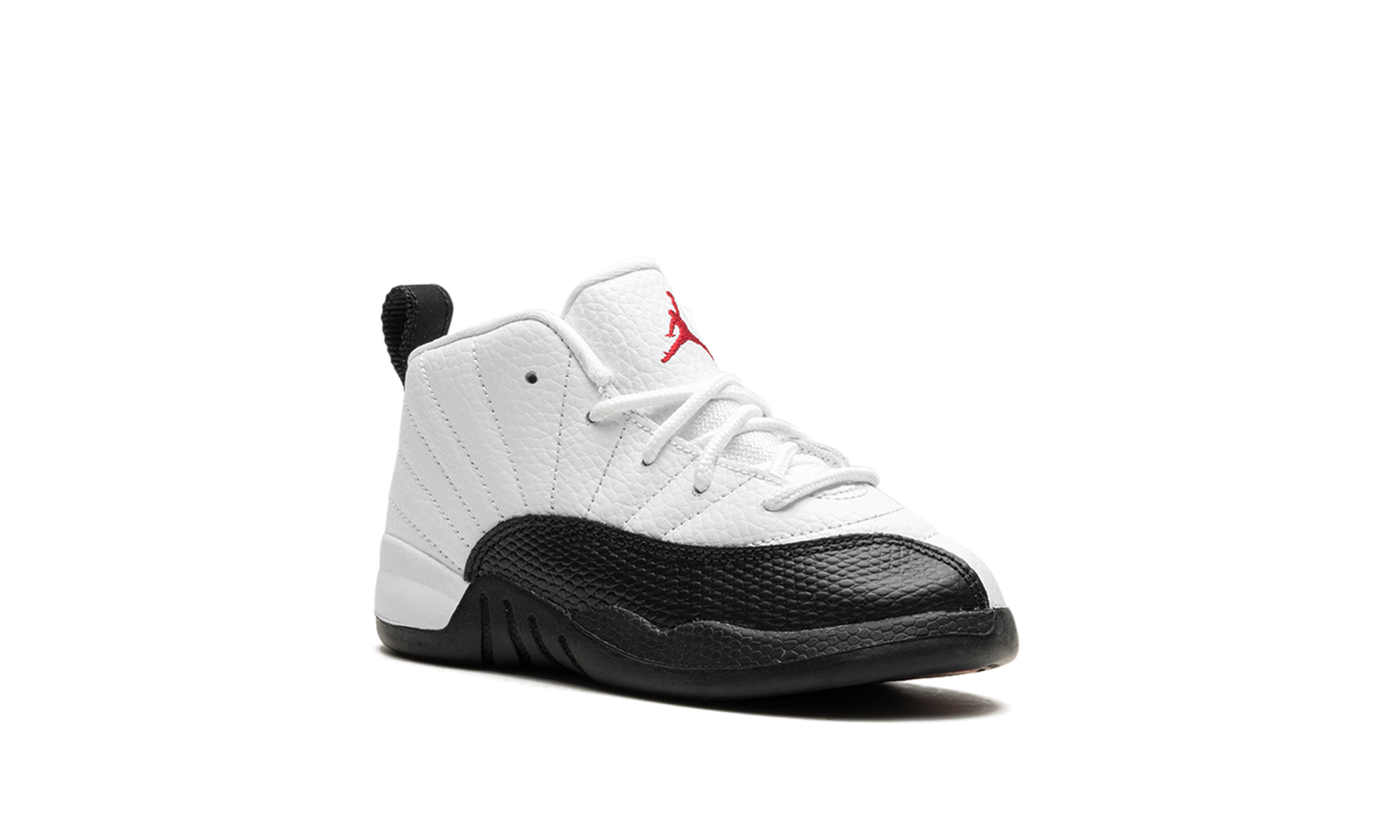 Step into an icon scaled for small feet with the Air Jordan 12 TD. a toddler-sized rendition of the bold "Red Taxi" colorway. This durable shoe is built with a white tumbled leather upper and a signature black lizard-textured mudguard. echoing the legendary basketball silhouette. Red accents on the outsole provide a striking pop of color. while the soft. supportive design ensures all-day comfort and stability for your future sneaker enthusiast.