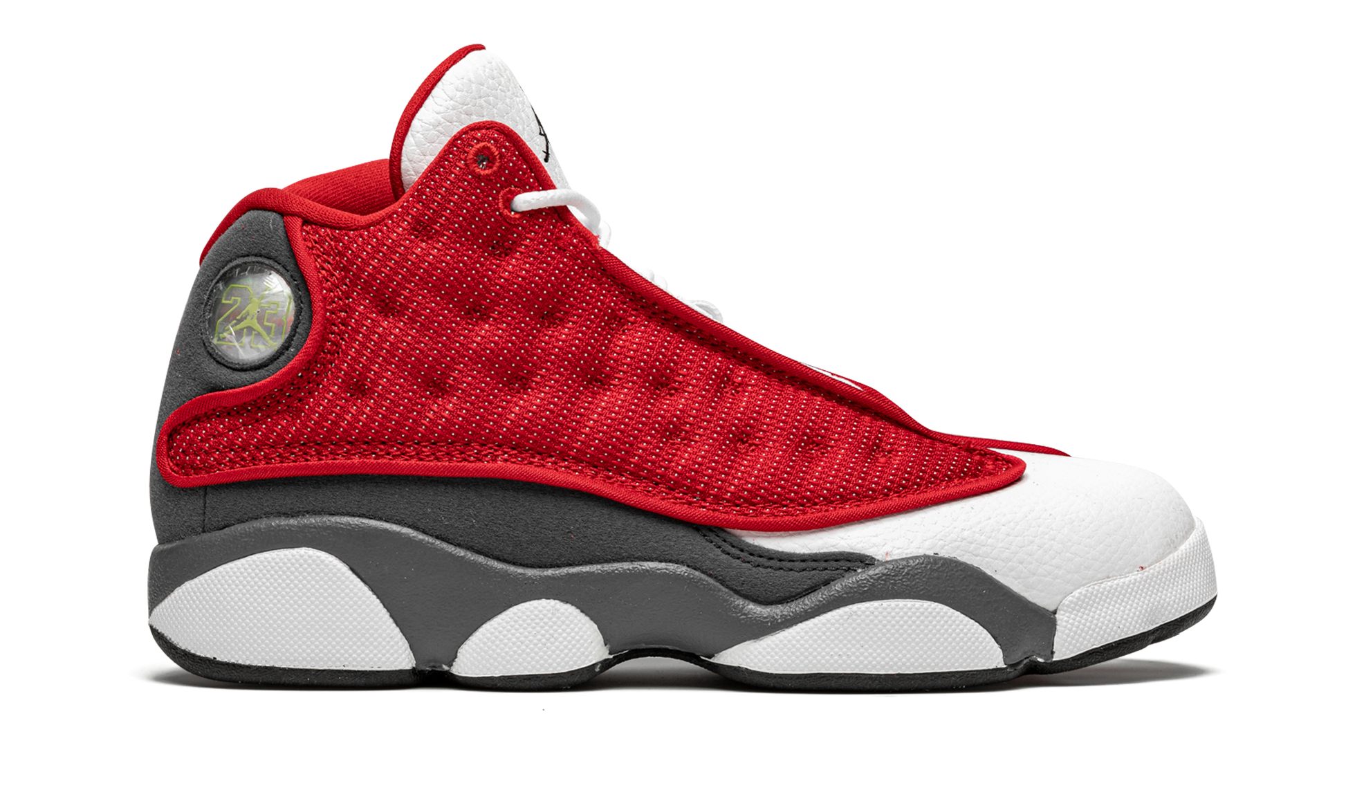 The Air Jordan 13 is the preschool sizing of the popular "Red Flint" version. which looks identical to the "Red Flint" high-top for adults. This iteration is arranged in an identical color block to that model with a head-turning Gym Red hue. The rest of the shoe is made with white tumbled leather on the toe and perforated leather on the tongue with a holographic emblem on the collar and grey suede on the mudguard. A black Jumpman logo is embroidered on the tongue and “Jordanâ€?text appears on the black nylon tag on the throat.