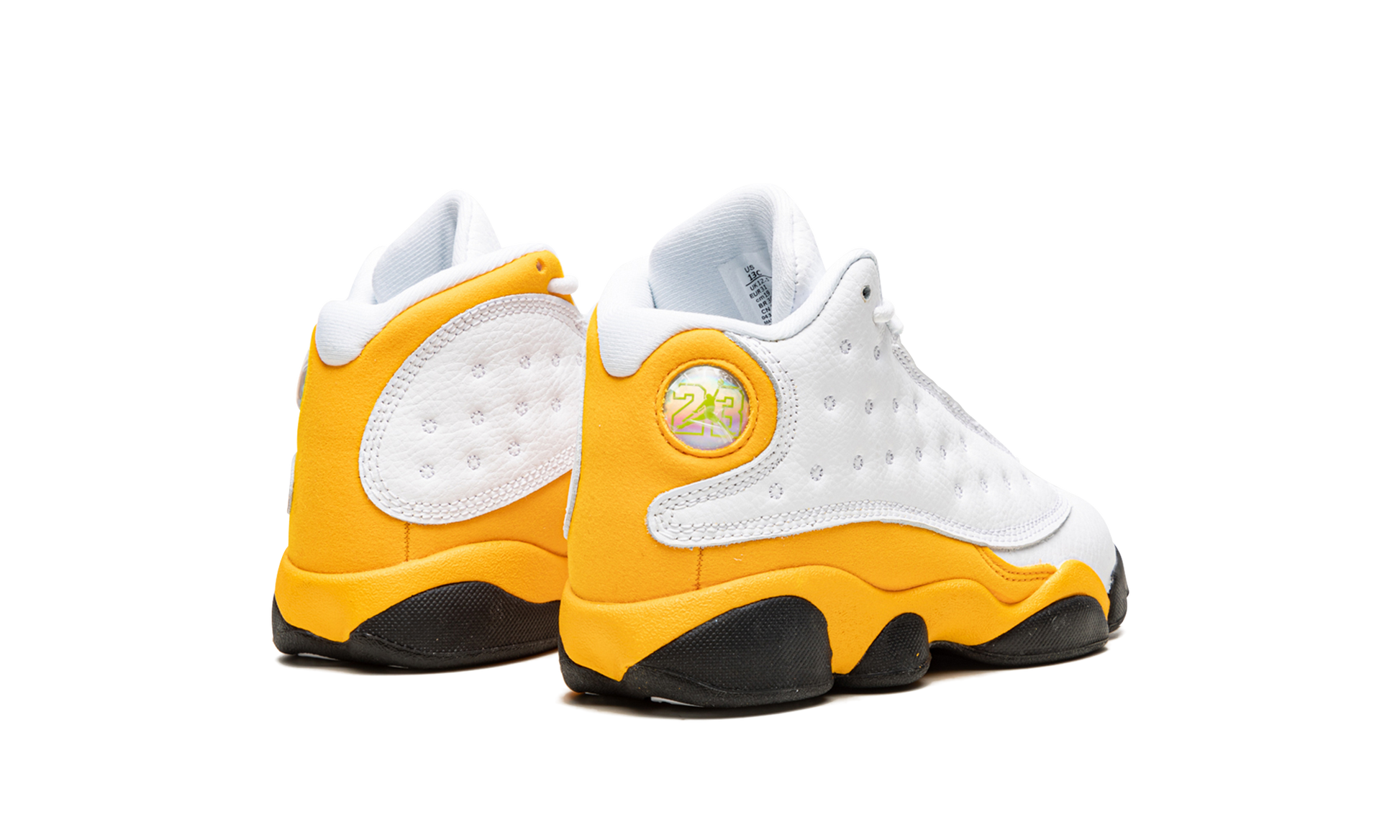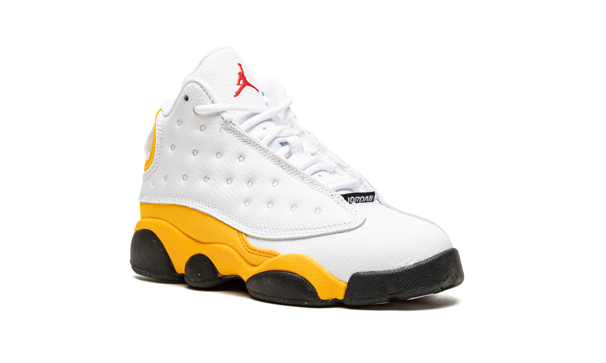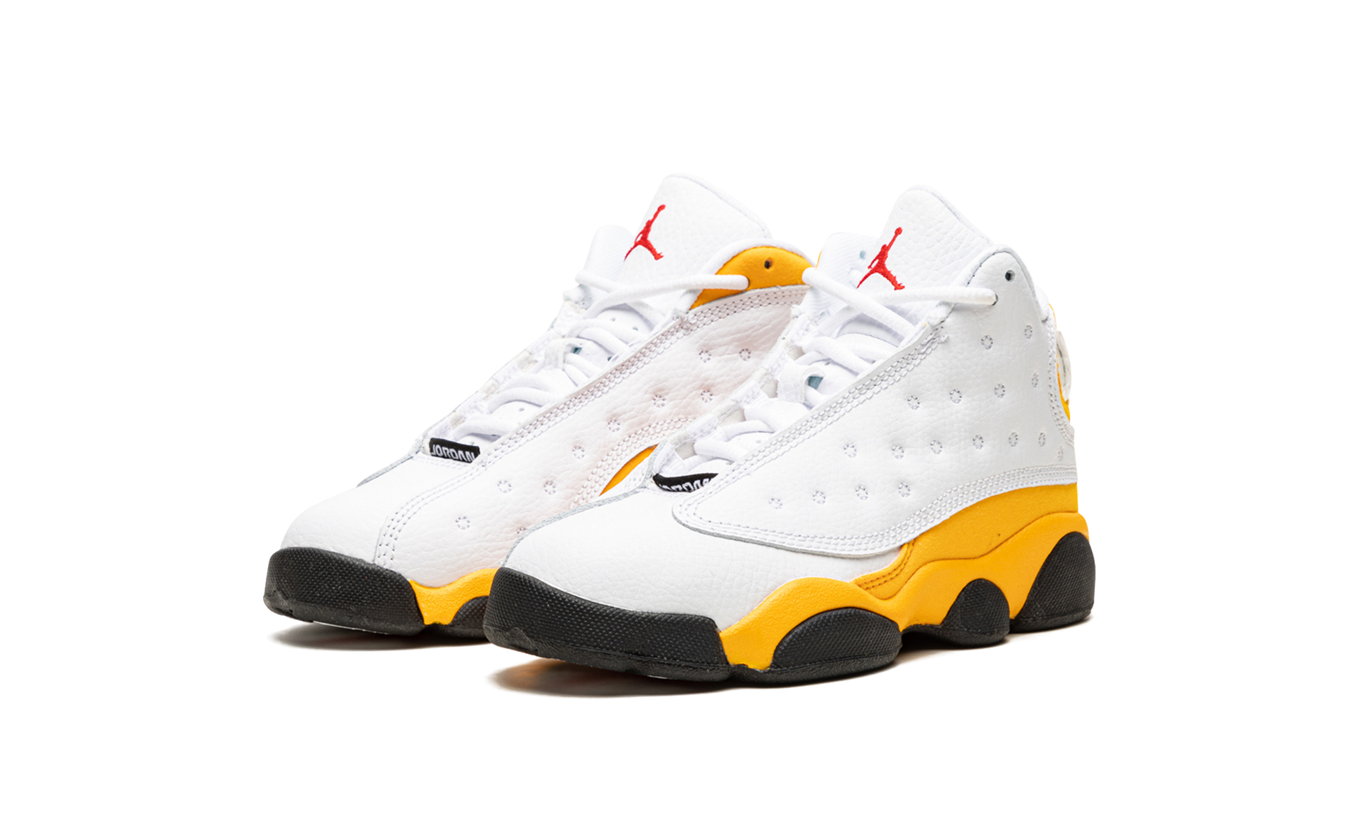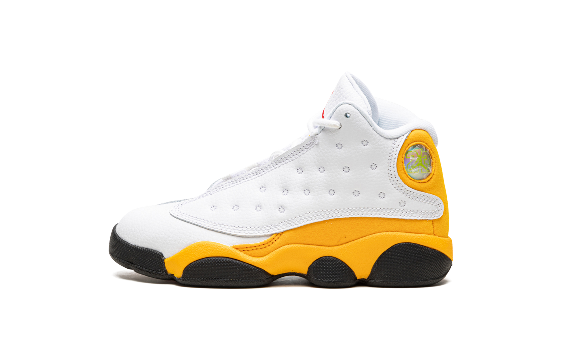 The Air Jordan 13 PS “Del Solâ€?is the preschool sizing of Michael Jordan's retro basketball shoe in a colorway unofficially inspired by the Los Angeles Lakers. The “Del Solâ€?features the team's white and yellow color scheme. and is devoid of any of the purple accenting found on the Lakers' team uniforms. Specifically. Del Sol-colored felt appears on the mudguard. heel. and collar. The rest of the upper is outfitted with white leather with dotted embroidery. Branding hits include a black Jordan tag with white lettering on the throat. an embroidered red Jumpman on the white leather tongue. and a holographic emblem on the collar.