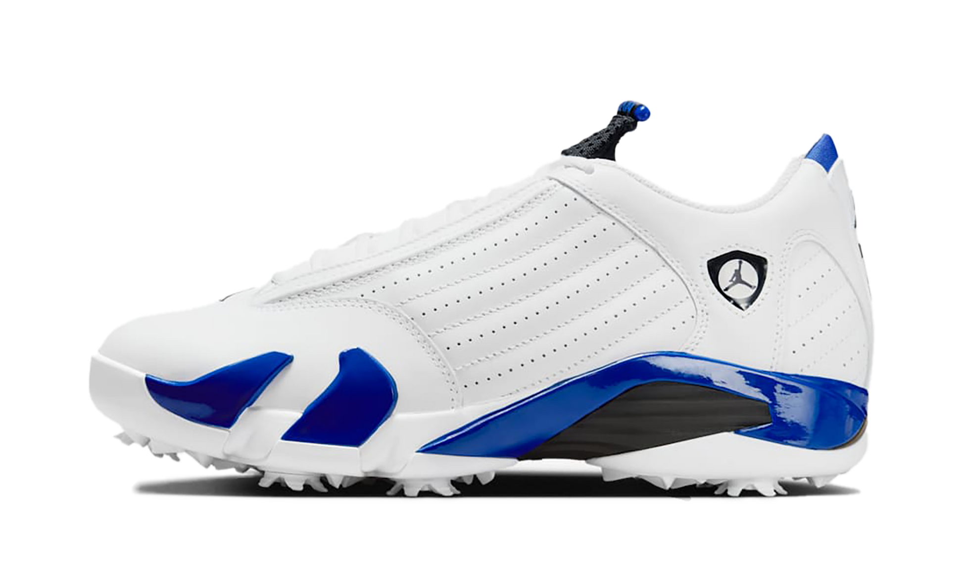 Hit the green with speed and style in the Air Jordan 14 Golf "Hyper Royal." This course-ready remix of Michael Jordan's Ferrari-inspired shoe delivers legendary style and elite performance. It features a genuine leather upper in a crisp White and Hyper Royal colorway. with a classic black heel panel. Air Zoom units in the forefoot and heel provide responsive cushioning. while the specialized outsole plate with seven removable spikes ensures phenomenal traction for a powerful. stable swing.