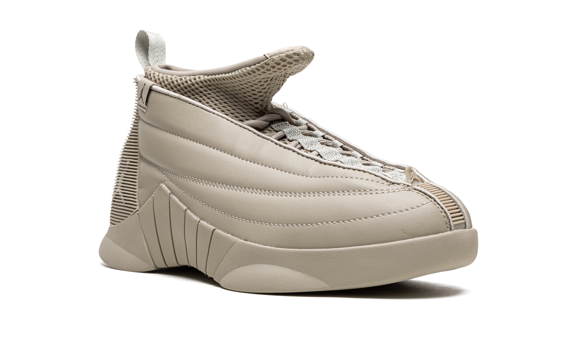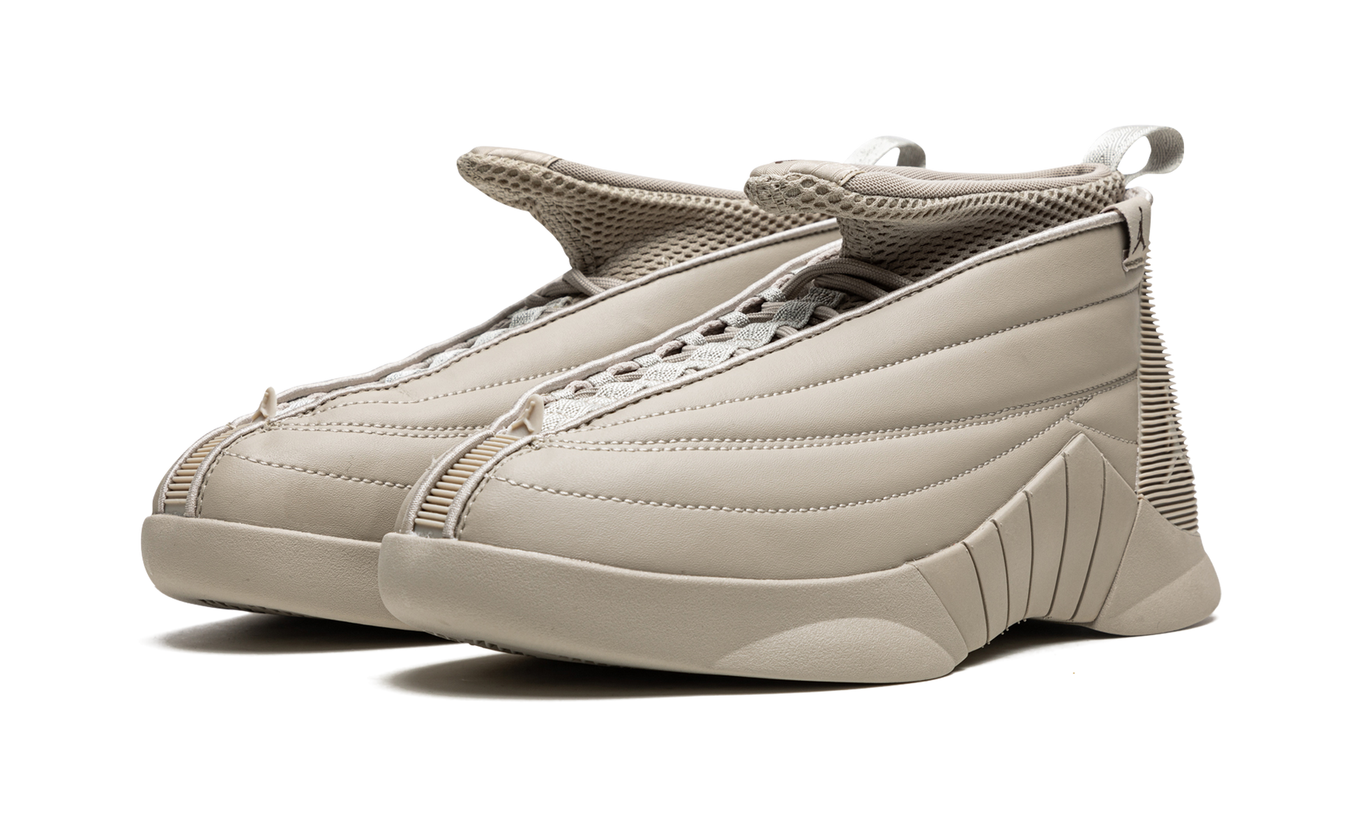 The Billie Eilish x Air Jordan 15 is a limited edition collaboration between the Grammy Award-winning singer and Jordan Brand on Michael Jordan's fifteenth signature shoe. Releasing around the same time as Eilish's collaborative neon green Air Jordan 1 KO in September 2021. the Jordan 15 is produced from at least one-fifth recycled materials. The entire shoe appears in a monochromatic beige colorway for a futuristic vibe. A tonal Jumpman is found on the lateral side of the heel and a small black Jumpman is located on the beige nylon tag on the collar. The Jordan 15's bootie-like mesh collar appears in the same beige hue as the rest of the shoe. Release date: September 30. 2021