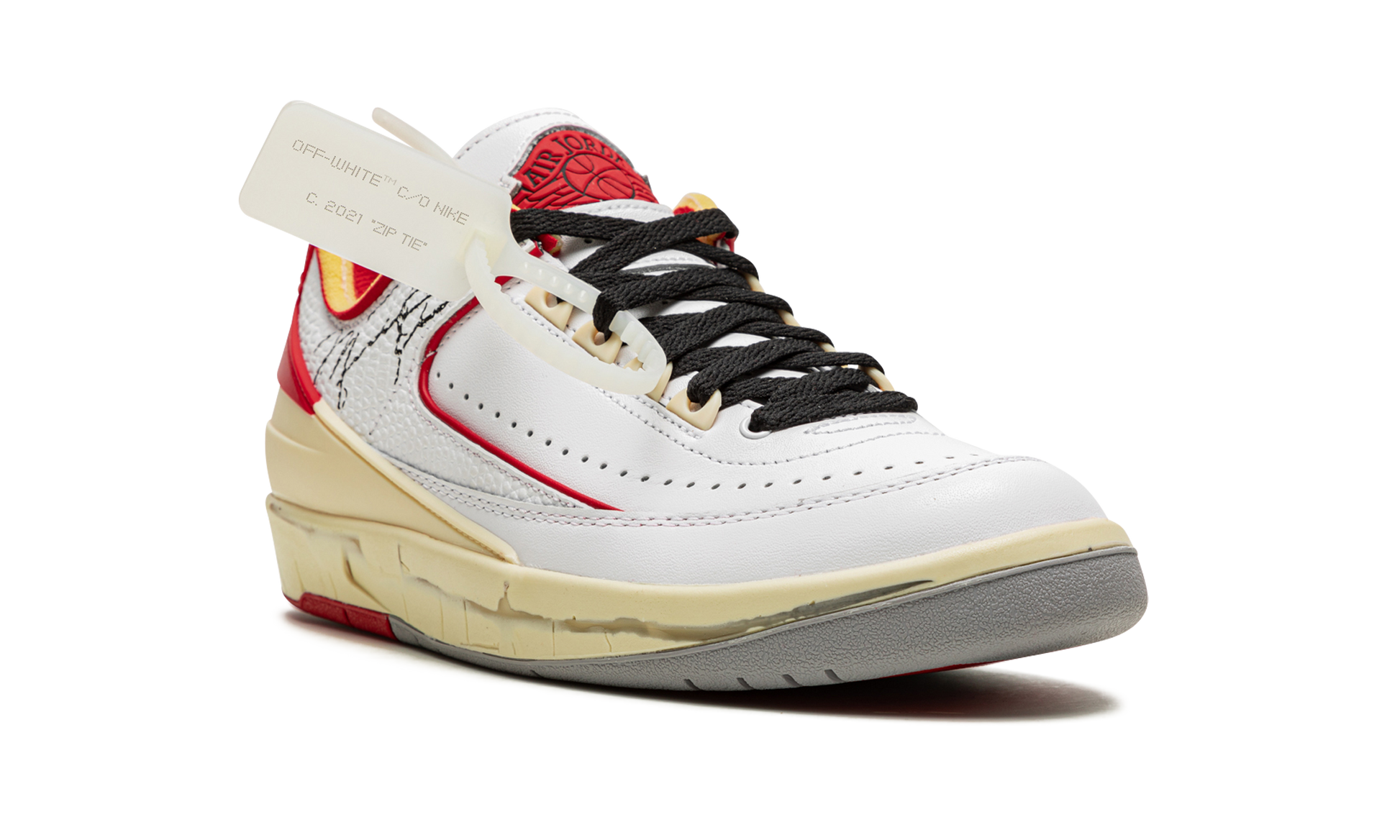 The Off-White x Air Jordan 2 Low OG “Chicagoâ€?is a collaboration between Virgil Abloh's high fashion and streetwear brand and Jordan Brand on a vintage-inspired colorway of Michael Jordan's second signature shoe. Off-White's Air Jordan 2 Low honors the classic retro basketball shoe's 35-year anniversary by reimagining the model's original “Chicagoâ€?colorway in the brand's popular “new-vintageâ€?aesthetic. Modifications to the design of the Air Jordan 2 Low by Off-White include a pre-yellowed. pre-“crackedâ€?midsole that replicates the look of crumbled soles associated with original 1987 pairs of the Jordan 2. The upper is constructed from white tumbled leather. Industrial-style Off-White branding is stamped onto the medial side of the shoe. Michael Jordan's signature appears on the collar of the lateral side. Red “Wingsâ€?branding resides on the white leather tongue and Off-White's signature “SHOELACESâ€?detailing can be found on the black laces. The exposed foam padding found on the collar is consistent with the styling of Off-White's Air Jordan collaborations.