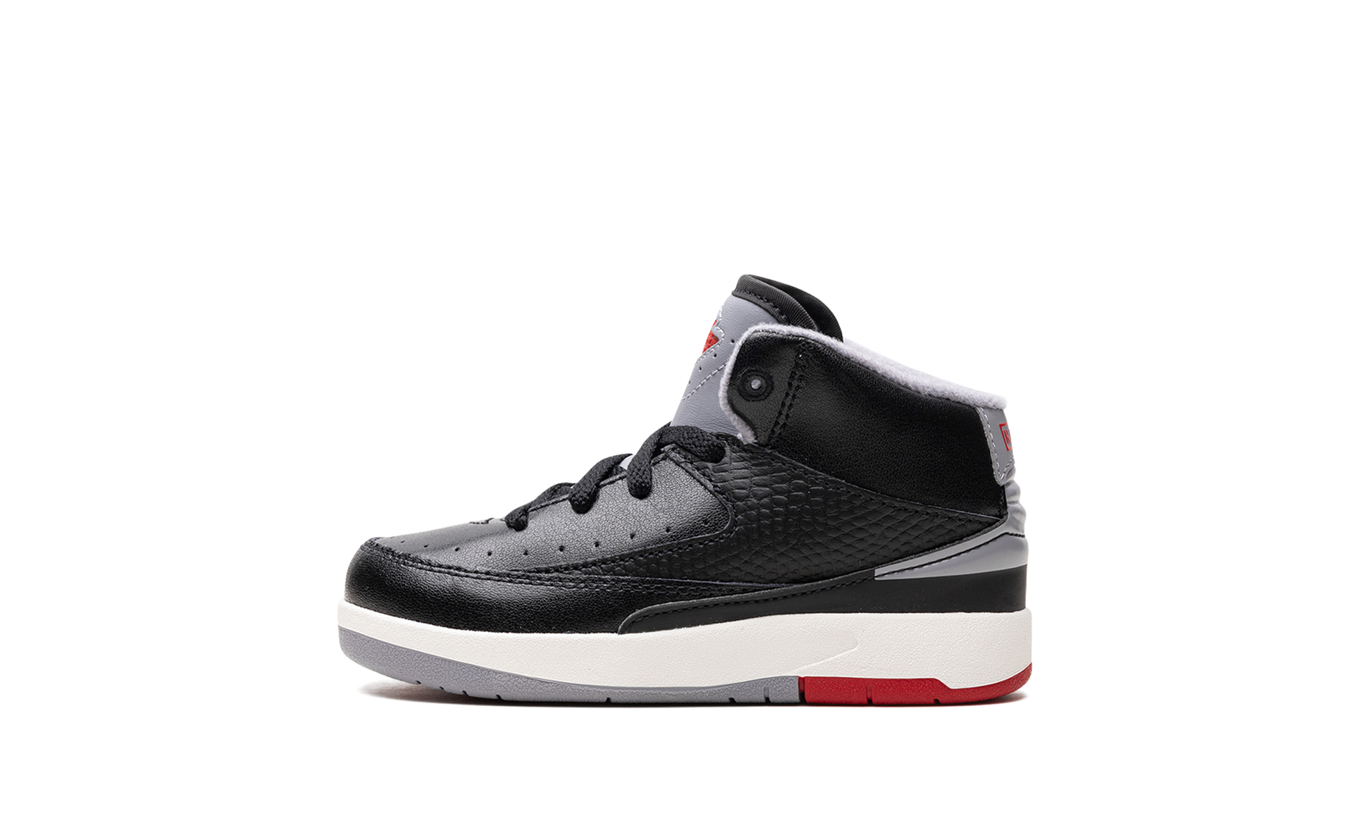 The Air Jordan 2 Retro TD "Black Cement" is the toddler sizing of Michael Jordan's second signature shoe in a colorway inspired by a legendary Air Jordan style. The shoe in question is the Air Jordan 3 “Black Cement.â€?one of the most iconic sneakers of all time. The “Black Cementâ€?Jordan 2 mimics the Jordan 3 of the same nickname's look with black. grey. and red detailing. The design has a black leather construction with contrasting Cement Grey accents on the heel. tongue. and inner lining. A red “Wingsâ€?logo appears on the tongue. Underfoot. the white midsole is paired with a red and grey rubber outsole. Release date: September 23. 2023
