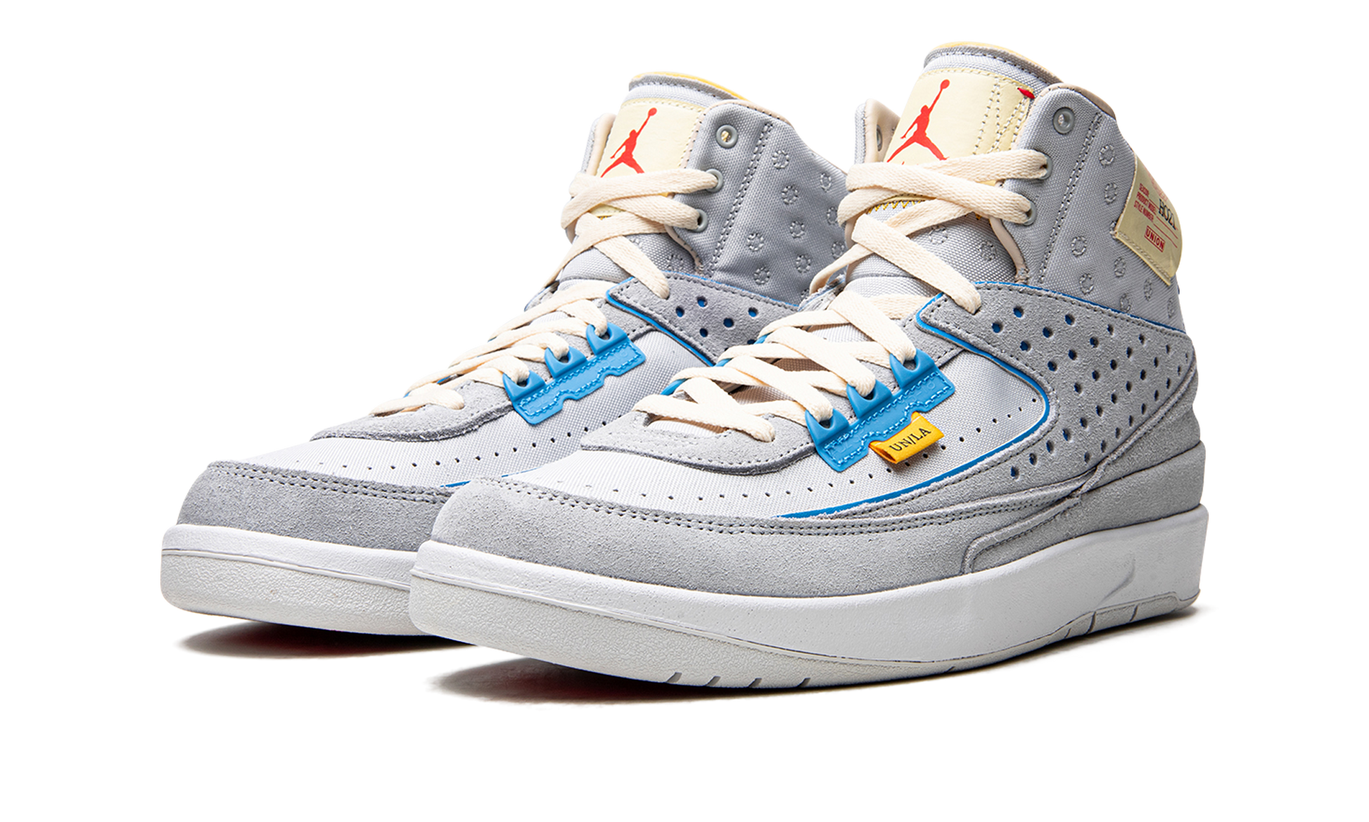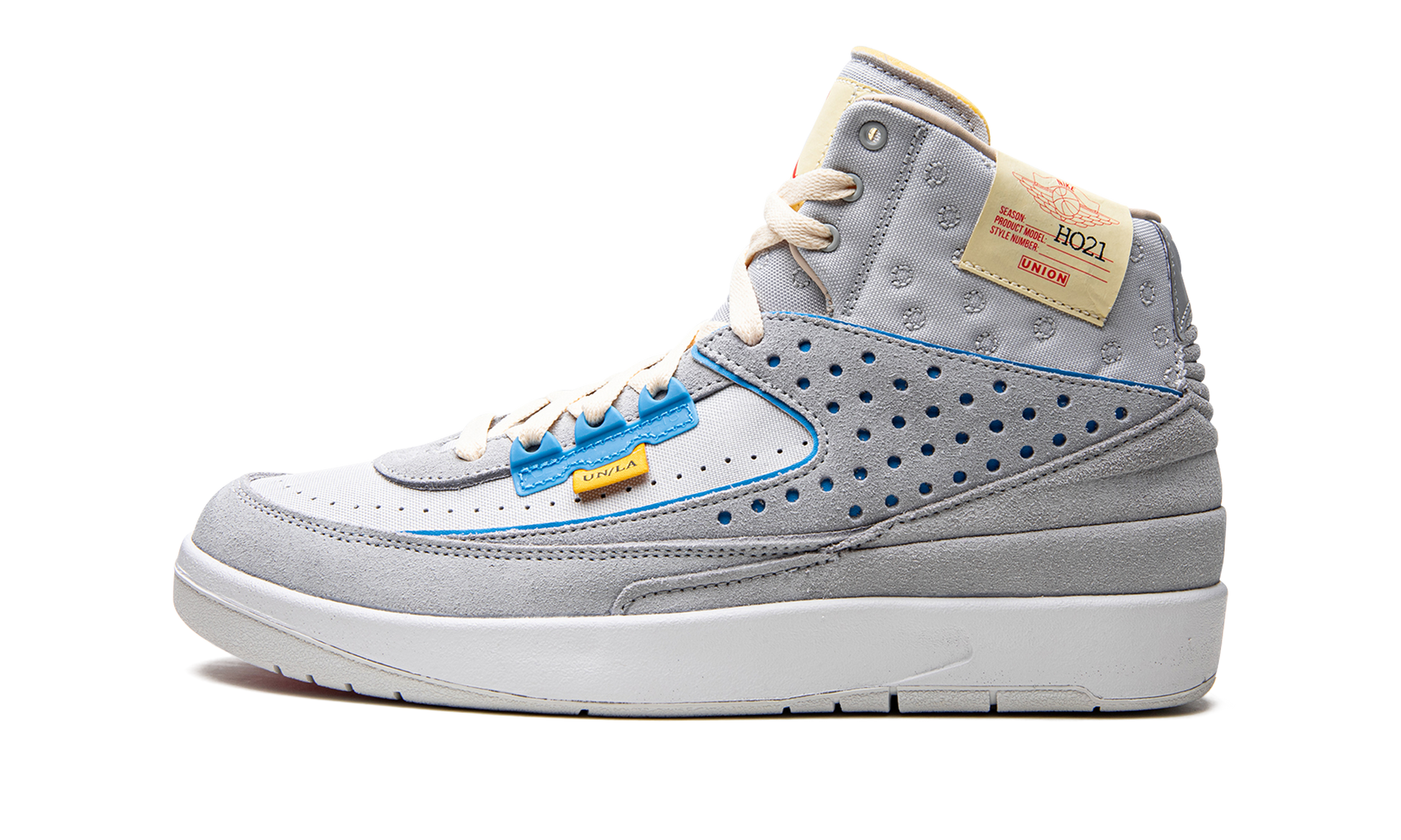 The Union x Air Jordan 2 “Grey Fogâ€?is one of two colorways of Michael Jordan's second signature shoe designed by Chris Gibbs and the Los Angeles based fashion boutique. Union's collaboration with Jordan Brand on the Air Jordan 2 honors the vintage basketball shoe's legacy with retro-modern design modifications that progress its timeless look. Released alongside the “Rattanâ€?colorway. Union's “Grey Fogâ€?Jordan 2 is complete with a light grey nylon and suede upper. Light blue piping along the upper is reminiscent of the blue accenting found on Carmelo Anthony's former Player Exclusive Air Jordan 2 colorway that received a retail release in 2004 and 2019. A yellow nylon tag with “UNION LAâ€?branding is found beneath the blue eyelets on the lateral side of the shoe. Additional branding appears in the form of a retro-style “Unionâ€?identification label on the collar and red Jumpman and “Union LAâ€?branding on the tongue. Cream-colored laces give the shoe a vintage look.