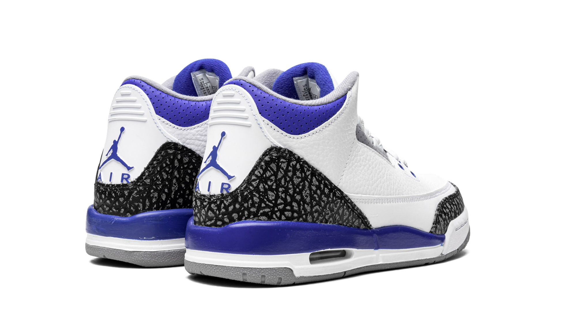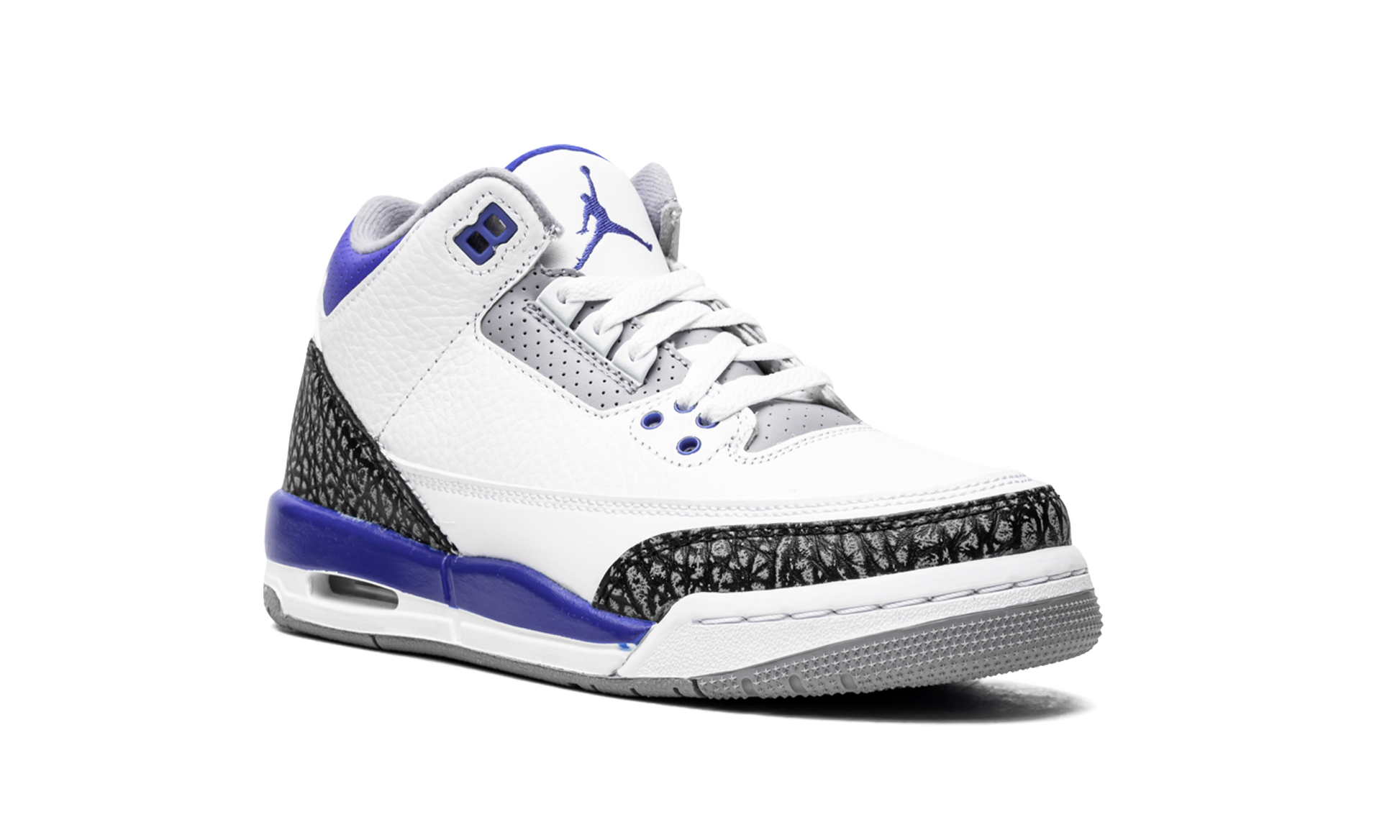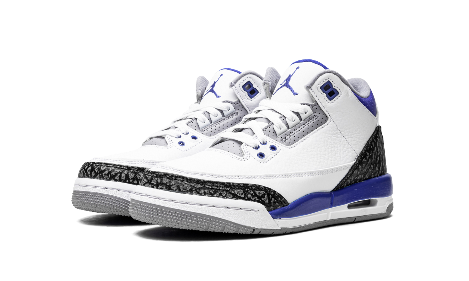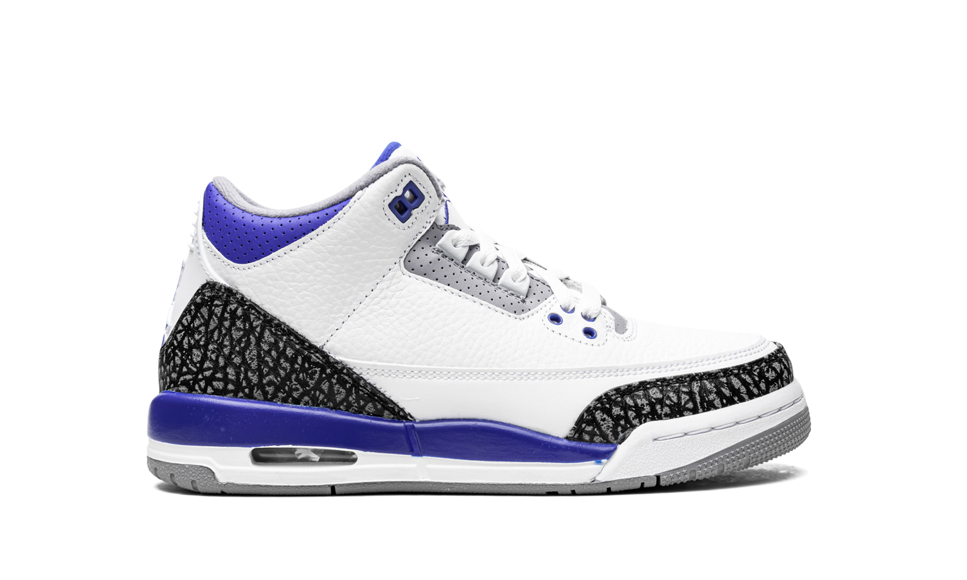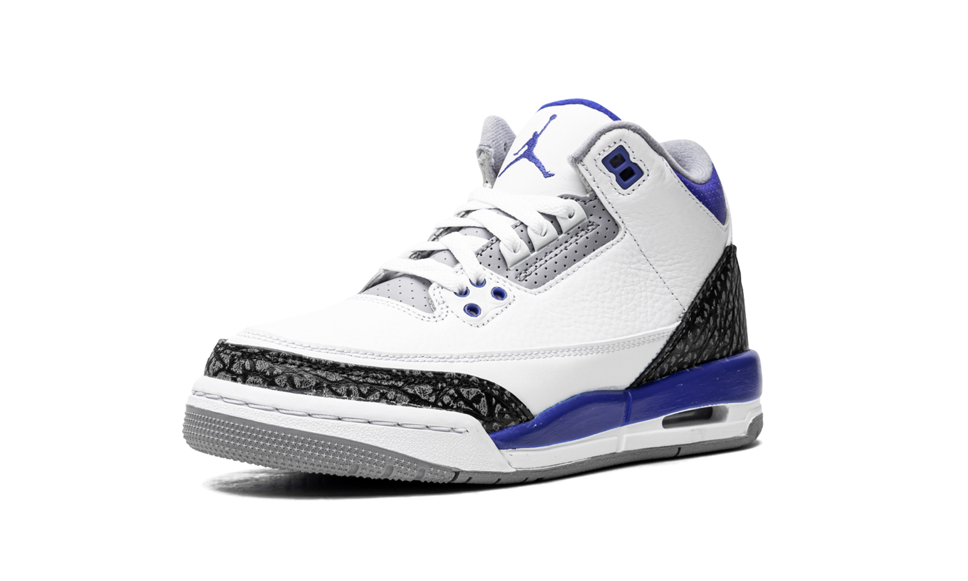 The Air Jordan 3 GS “Racer Blueâ€?is the youth sizing of the July 2021 release of Michael Jordan's third signature shoe in a classic colorway. Joining popular Air Jordan 3s like the “True Blue.â€?“Knicks.â€?and “UNCâ€?styles to feature blue on its design. the “Racer Blueâ€?is a highly versatile option for all seasons. White tumbled leather forms the base of the shoe. Contrasting grey elephant print can be found on the toe and heel. The variation of elephant print that graces the “Racer Blueâ€?is darker than the material found on many Jordan 3 releases. A dotted Racer Blue leather construction highlights the look of the collar. The deep blue hue also graces the painted mid-panel as well as the Jumpman on the heel and embroidered Jumpman on the white tumbled leather tongue. A small visible Air bubble in the heel of the white midsole rounds out the look of the Air Jordan 3 GS “Racer Blue.â€?Release date: July 10. 2021