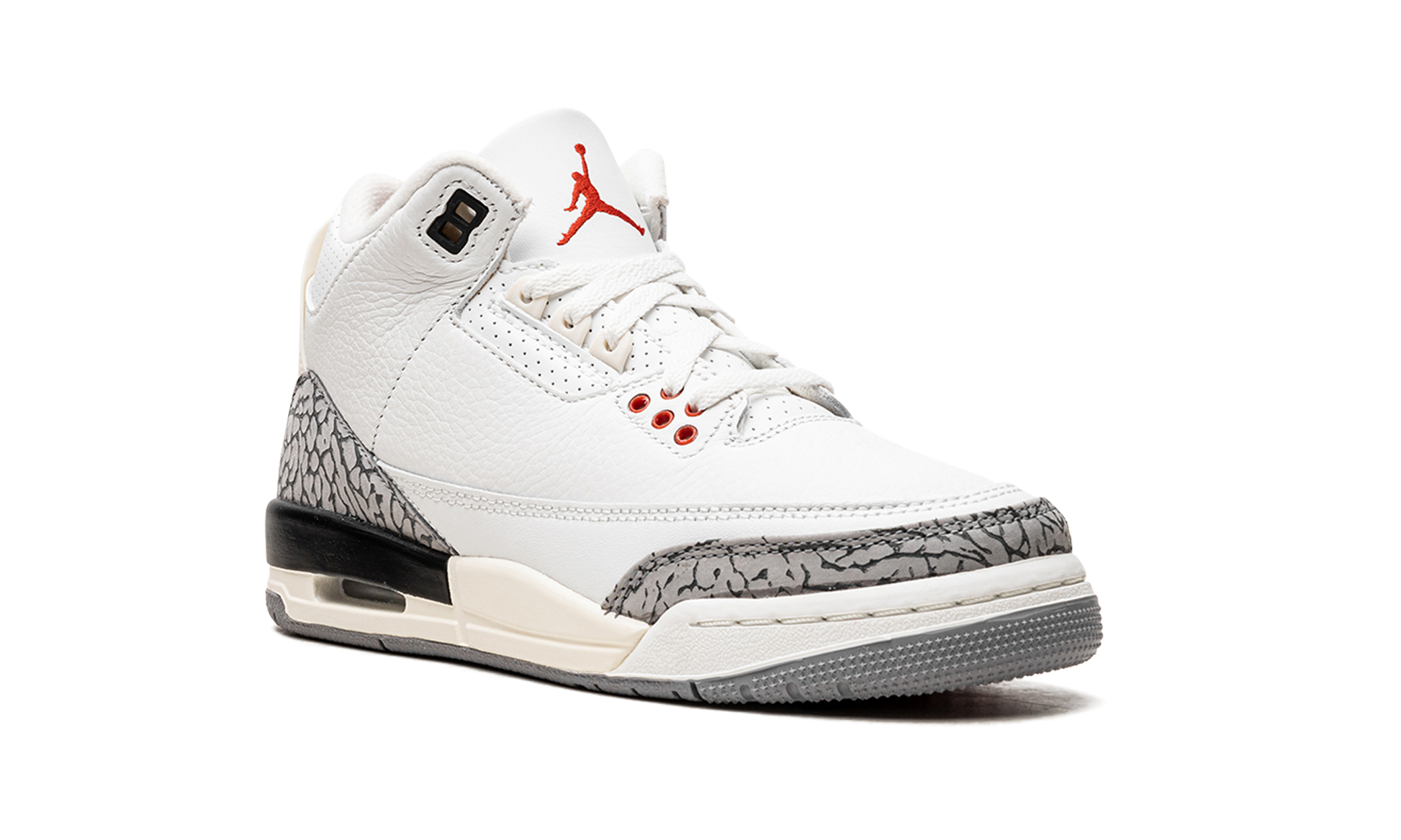 The Air Jordan 3 GS “White Cement Reimaginedâ€?is the youth sizing of the special version of the vintage basketball sneaker that replicates its original design. Released in 2023 to celebrate the iconic Jordan 3's 35th anniversary. the “White Cement Reimaginedâ€?retains the look of the model's “White Cementâ€?colorway with accurate-to-original panels. colors. and overall shape. Faithful to the 1988 version of the Jordan 3 “White Cement.â€?the “Reimaginedâ€?features a higher-cut ankle collar inspired by the OG Jordan 3's design. It also is equipped with a white leather upper with contrasting grey elephant print on the toe and heel. which has also been modified to look like the detailing on the original Jordan 3. The “Nike Airâ€?branded heel counter has an aged. vintage look. as does the midsole. Release date: March 11. 2023