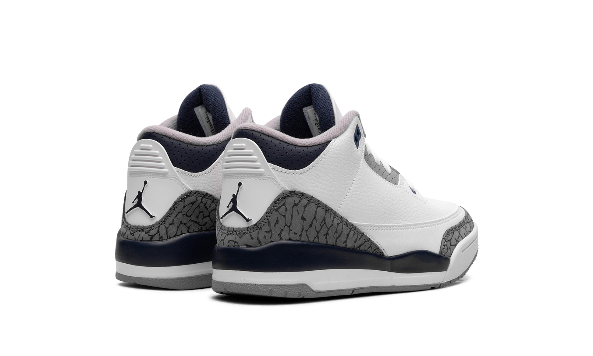 The Air Jordan 3 PS "Midnight Navy" is the preschool sizing of Michael Jordan's third signature shoe with navy accents. The “Midnight Navyâ€?colorway features a white leather upper with elephant print overlays on the toe and heel. A Midnight Navy-colored mudguard contrasts the look. as do the Midnight Navy eyelet holes. More Midnight Navy accenting is featured on the Jumpman on the white leather tongue and on the Jumpman on the heel. The white midsole has a clear Air bubble in the heel. A grey rubber outsole completes the look. Release date: January 13. 2024