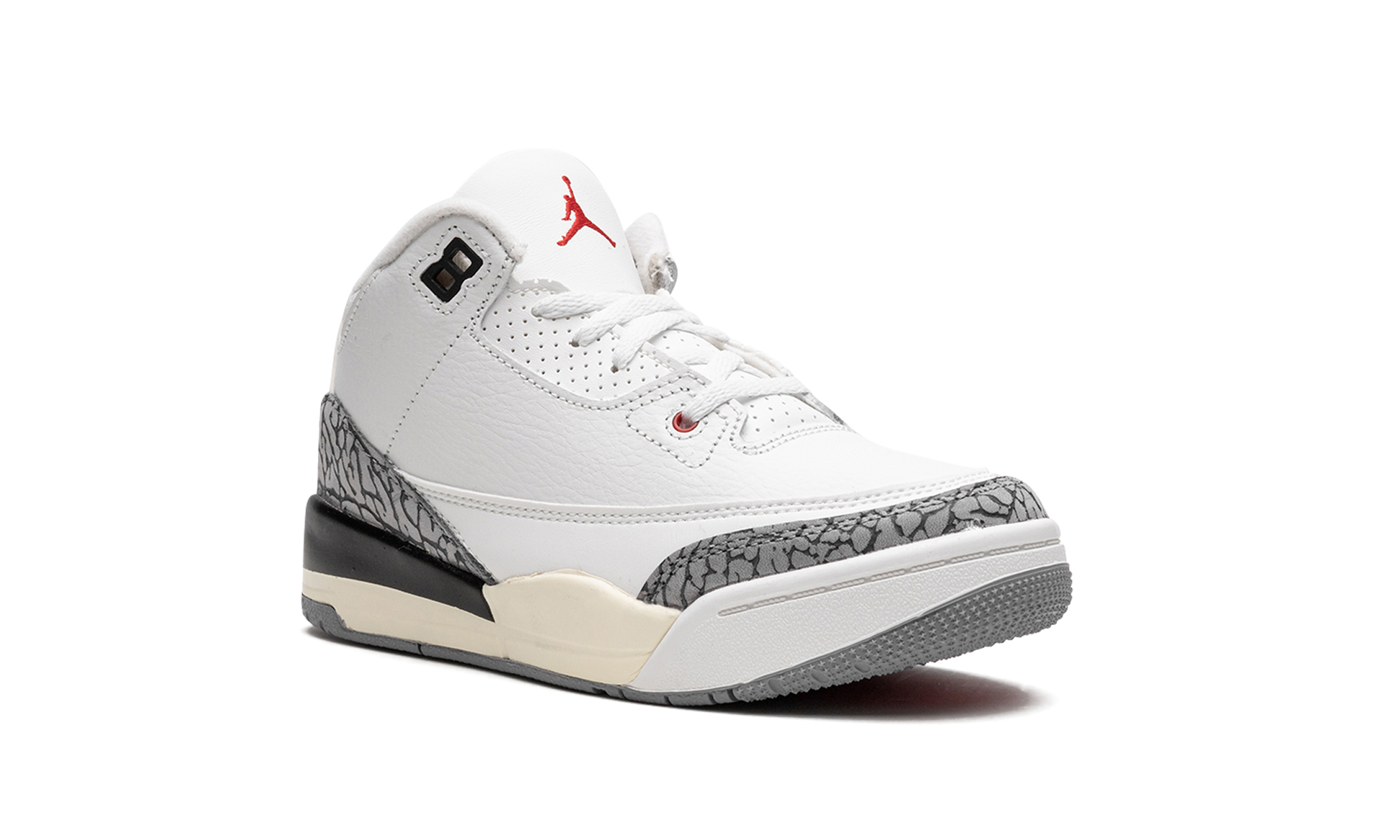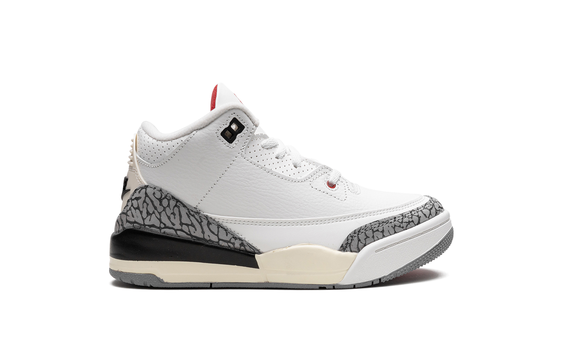 The Air Jordan 3 PS “White Cement Reimaginedâ€?is the preschool sizing of the retro basketball sneaker that replicates the model's original design. Released by Jordan Brand in 2023 to celebrate the iconic Jordan 3's 35th anniversary. the “White Cement Reimaginedâ€?retains the look of the model's “White Cementâ€?colorway with accurate-to-original panels. colors. and overall shape. Faithful to the 1988 version of the Jordan 3 “White Cement.â€?the “Reimaginedâ€?features a higher-cut ankle collar inspired by the OG Jordan 3's design. It also is equipped with a white leather upper with contrasting grey elephant print on the toe and heel. which has also been modified to look like the detailing on the original Jordan 3. Release date: March 11. 2023