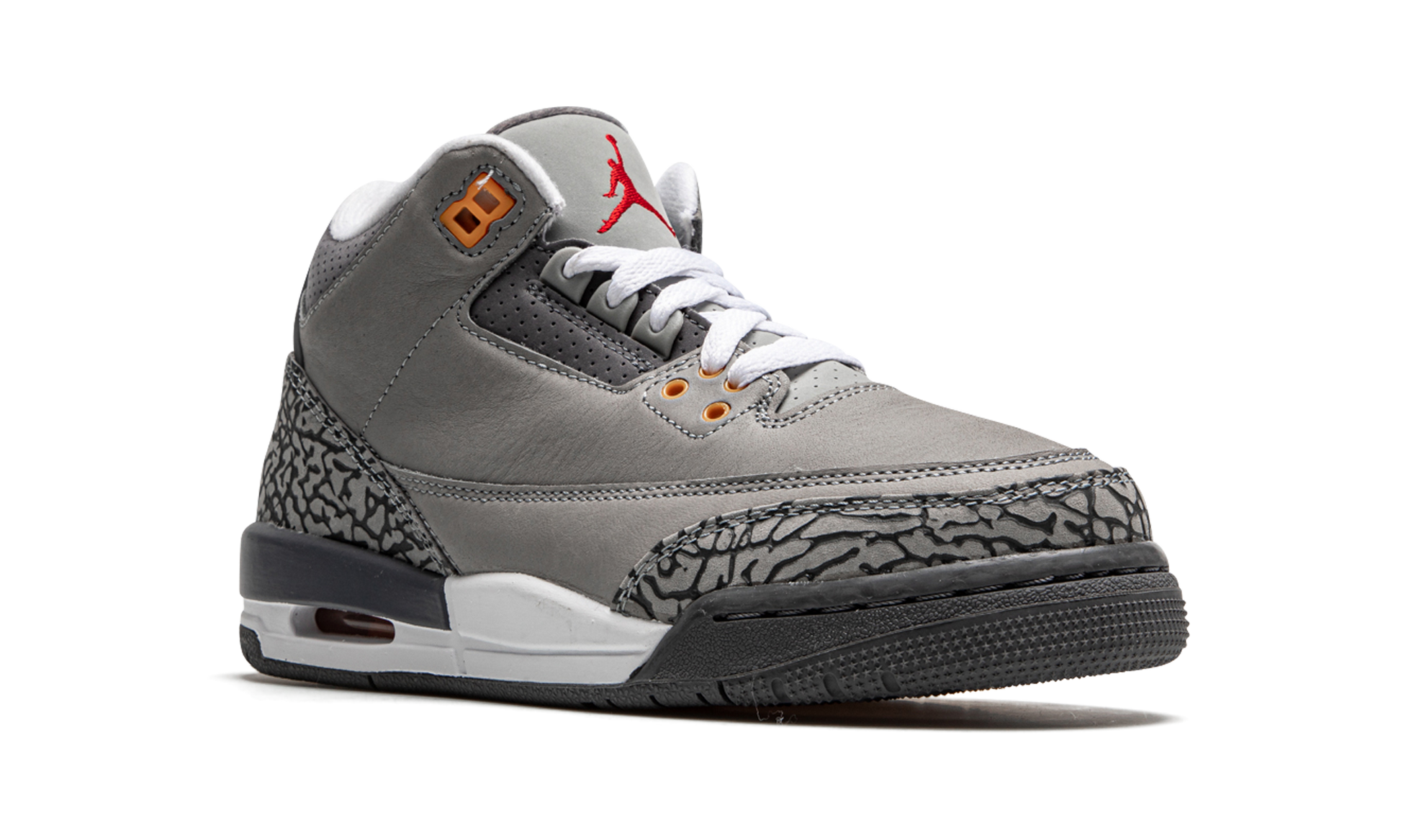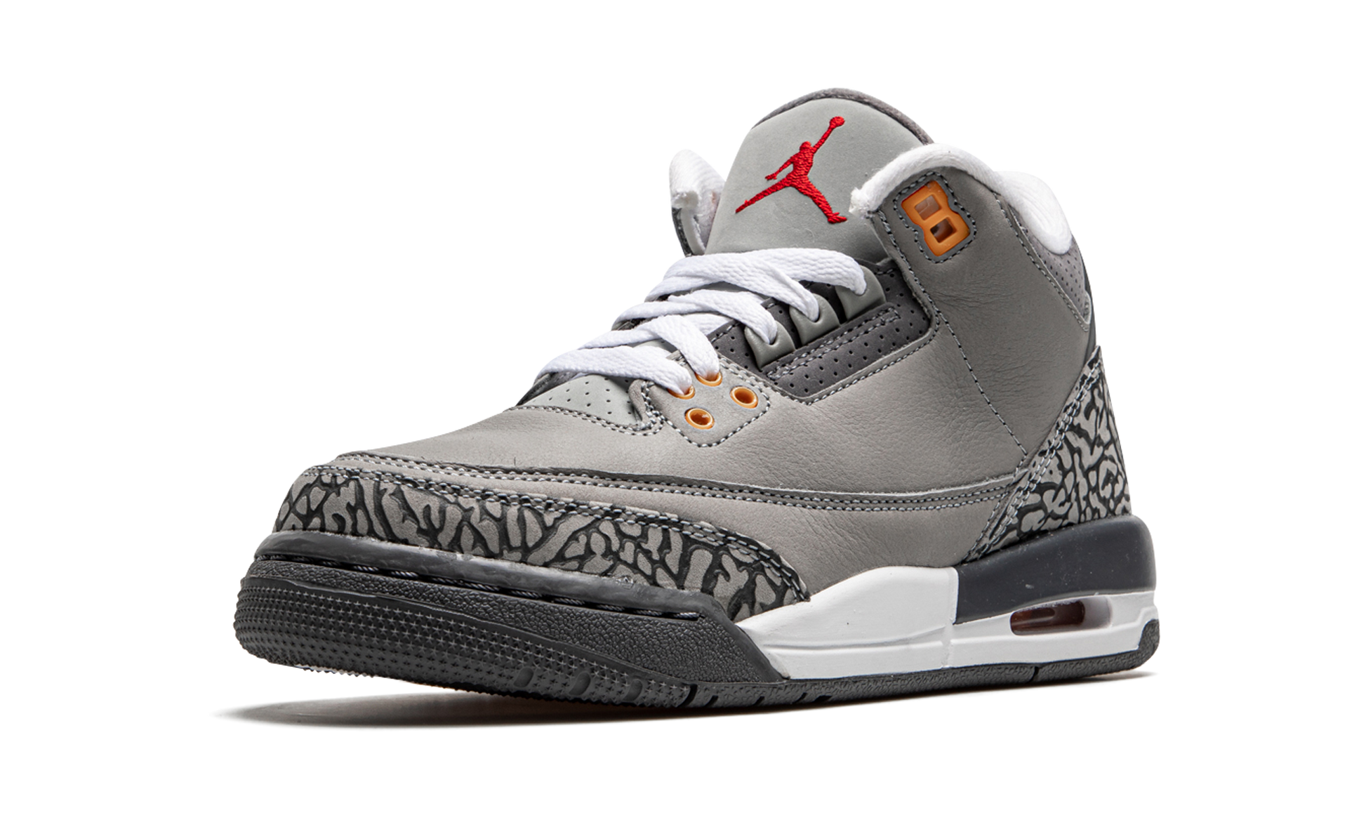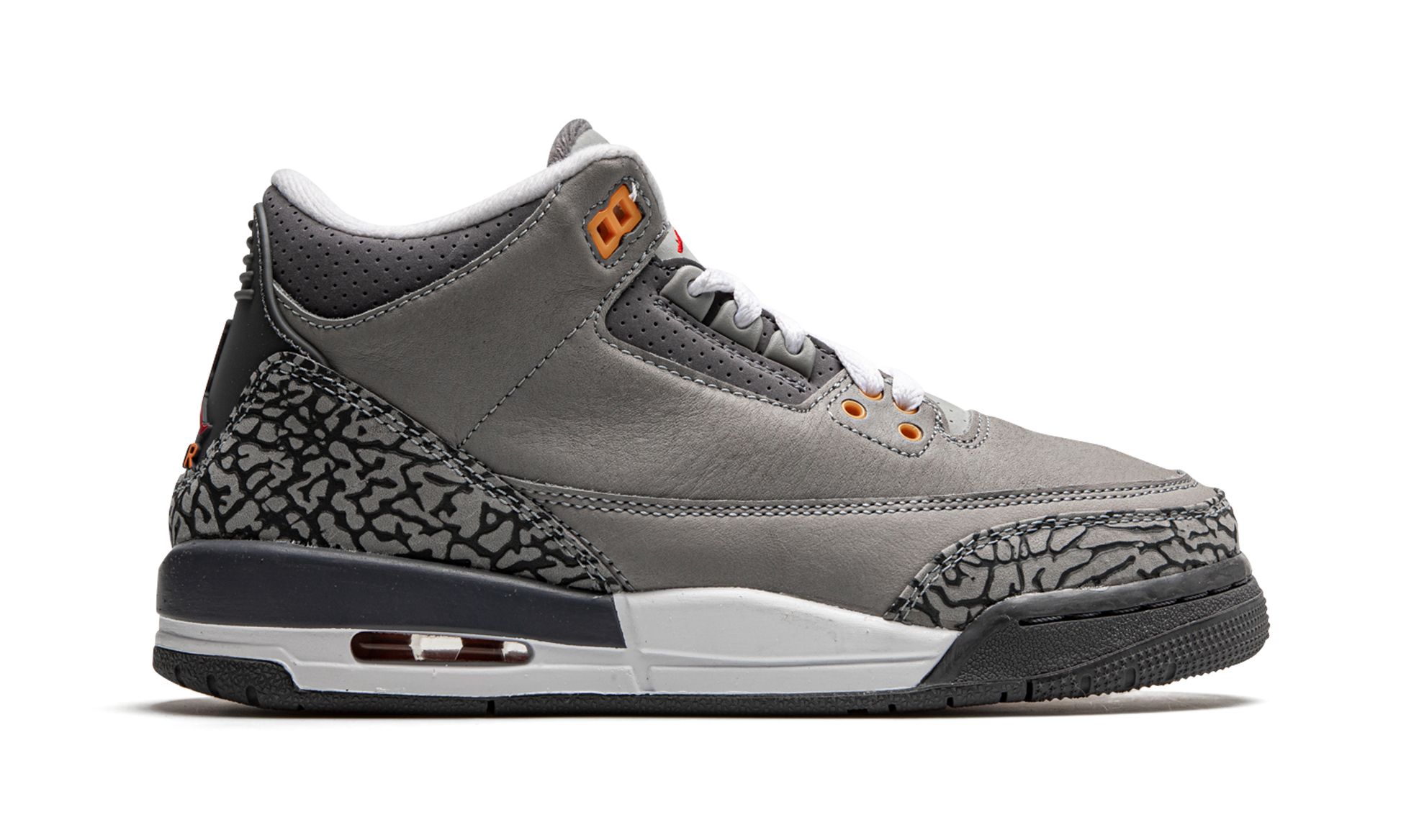 Embrace a timeless favorite with the Air Jordan 3 Retro GS "Cool Grey." This Grade School-sized sneaker is a highly anticipated reissue of the popular 2007 colorway. It features a sleek Cool Grey leather upper accented by the signature elephant print overlays in a matching tonal shade. Subtle but vibrant pops of Orange Peel and Sport Red on the molded eyelets and Jumpman branding break up the neutrals. With visible Air cushioning. this shoe delivers both legendary style and supreme comfort.