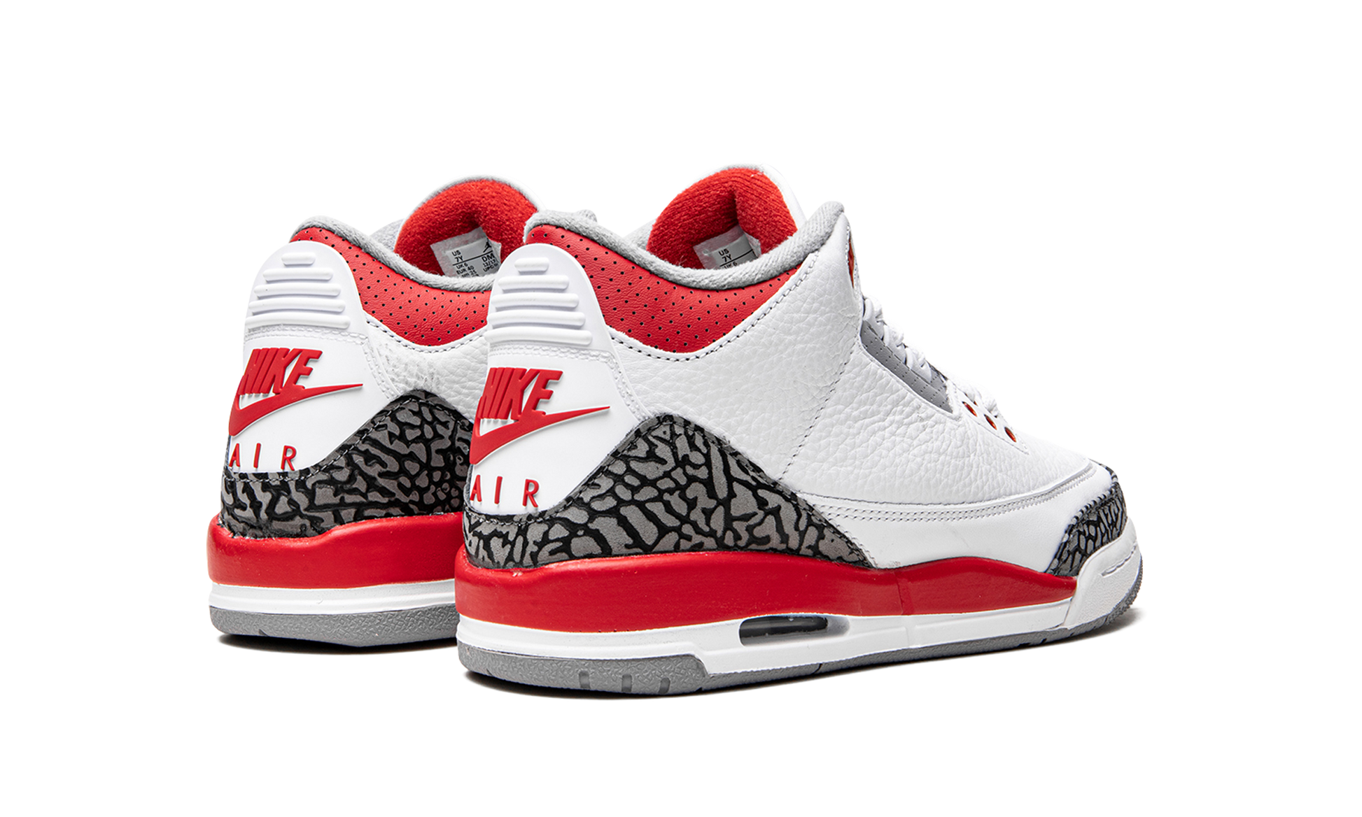 The Air Jordan 3 GS “Fire Redâ€?is the youth sizing of the 2022 release of the original Jordan 3 colorway. This modern reissue of the “Fire Redâ€?marks the first time the shoe has featured its iconic “Nike Airâ€?branding on the heel since the original release in 1988. The upper features a white leather base with contrasting grey elephant print on the toe cap and heel. Fire Red-colored leather appears on the collar. The blazing red hue is also found on the “Nike Airâ€?detailing on the heel. on the top eyelet holes. and on the Jumpman that's embroidered on the white leather tongue. Fire Red detailing also appears on the painted mudguard above the white foam midsole. A visible Air unit in the heel of the shoe completes the look. Release date: September 10. 2022