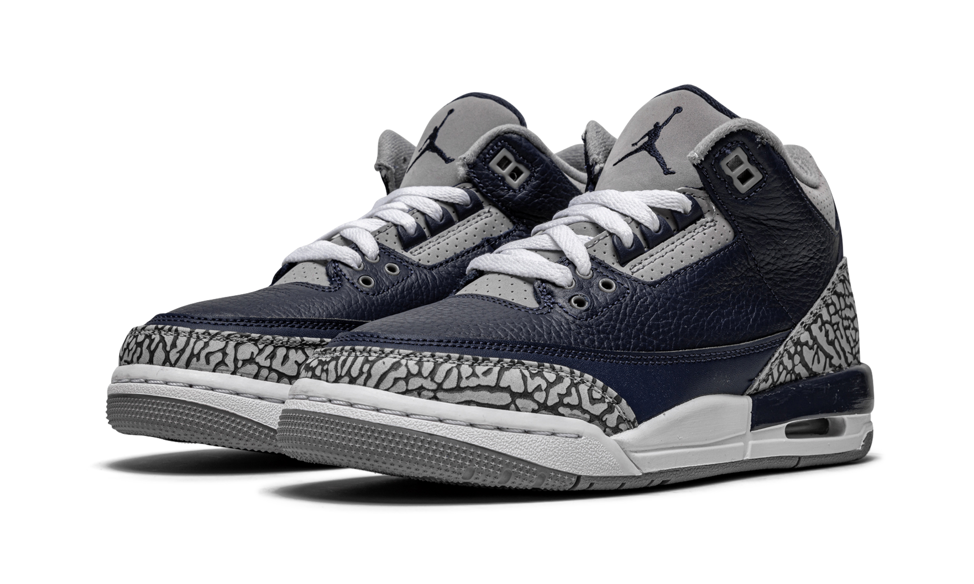 The Air Jordan 3 GS “Georgetownâ€?is the youth sizing of Michael Jordan's third signature shoe in a Georgetown Hoyas inspired colorway. A March 2021 release by Jordan Brand. the “Georgetownâ€?unofficially salutes the Big East college basketball team by referencing its uniform colors in its design. Further. the look draws favorably to many Player Exclusive colorways given to members of the Hoya family by Jordan Brand. The Midnight Navy tumbled leather upper is contrasted with perforated Cement Grey leather panels on the eyelets. collar. and tongue. The Jordan 3's original elephant print detailing appears on the heel and toe. A navy blue embroidered Jumpman is stitched onto the grey leather tongue and a white Jumpman logo can be found on the back of the shoe. A small visible Air unit resides inside of the heel of the white midsole. Release date: March 24. 2021.