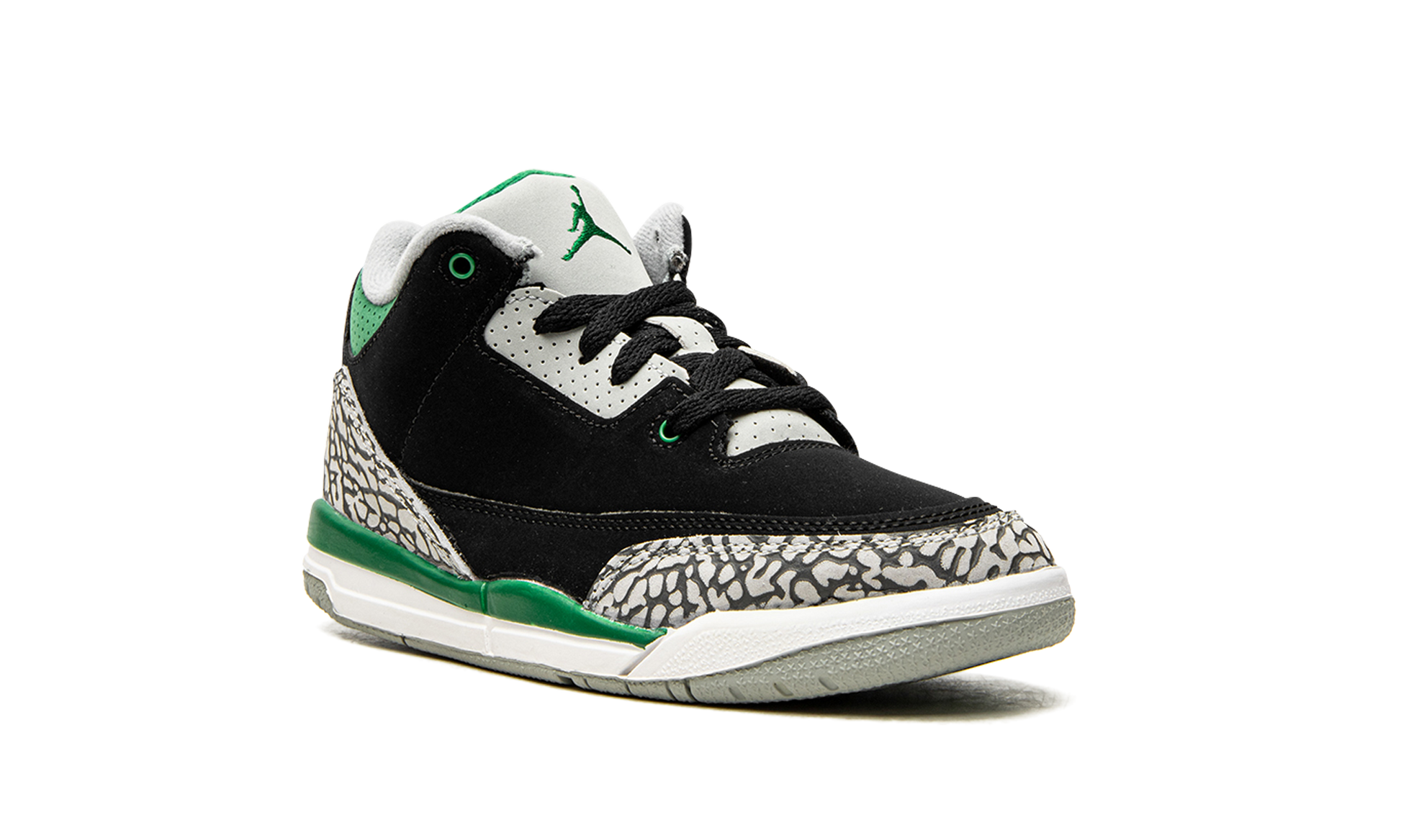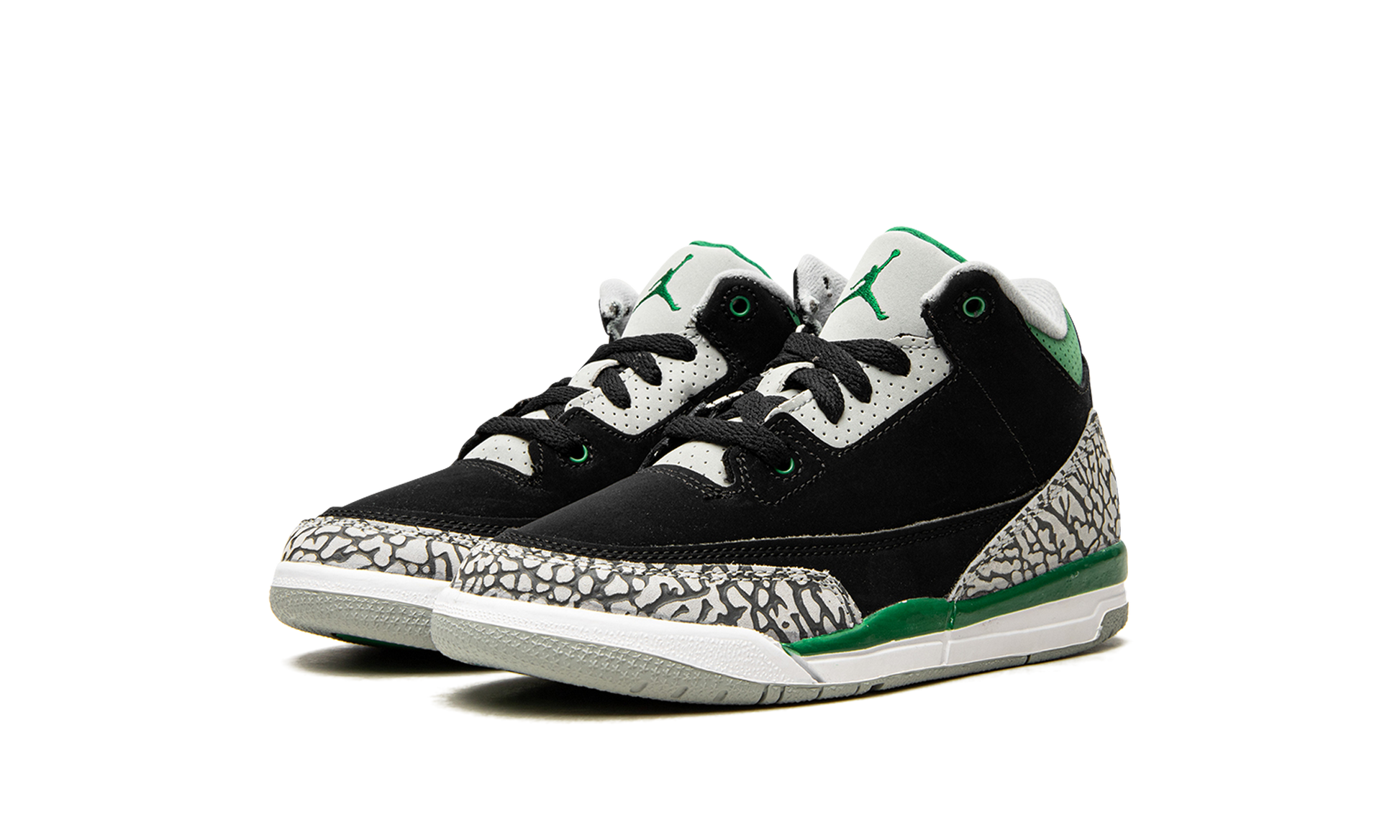 The Air Jordan 3 PS “Pine Greenâ€?is the preschool version of the Oregon Ducks-inspired colorway of Michael Jordan's first signature shoe. A Fall 2021 release. the “Pine Greenâ€?is inspired by various unreleased Player Exclusive Air Jordan and Nike shoes given to student athletes and facility members of the Oregon Ducks. Black synthetic nubuck covers the base of the shoe. Perforated Pine Green leather appears on the collar and dotted grey leather is located on the eyelets. Contrasting elephant prints on the toe and heel bring a decidedly retro look to the Jordan 3. A Pine Green Jumpman is embroidered on the grey leather tongue and a grey Jumpman appears on the heel. Finishing touches include a green painted mudguard. white foam midsole. and grey outsole. Release date: October 30. 2021