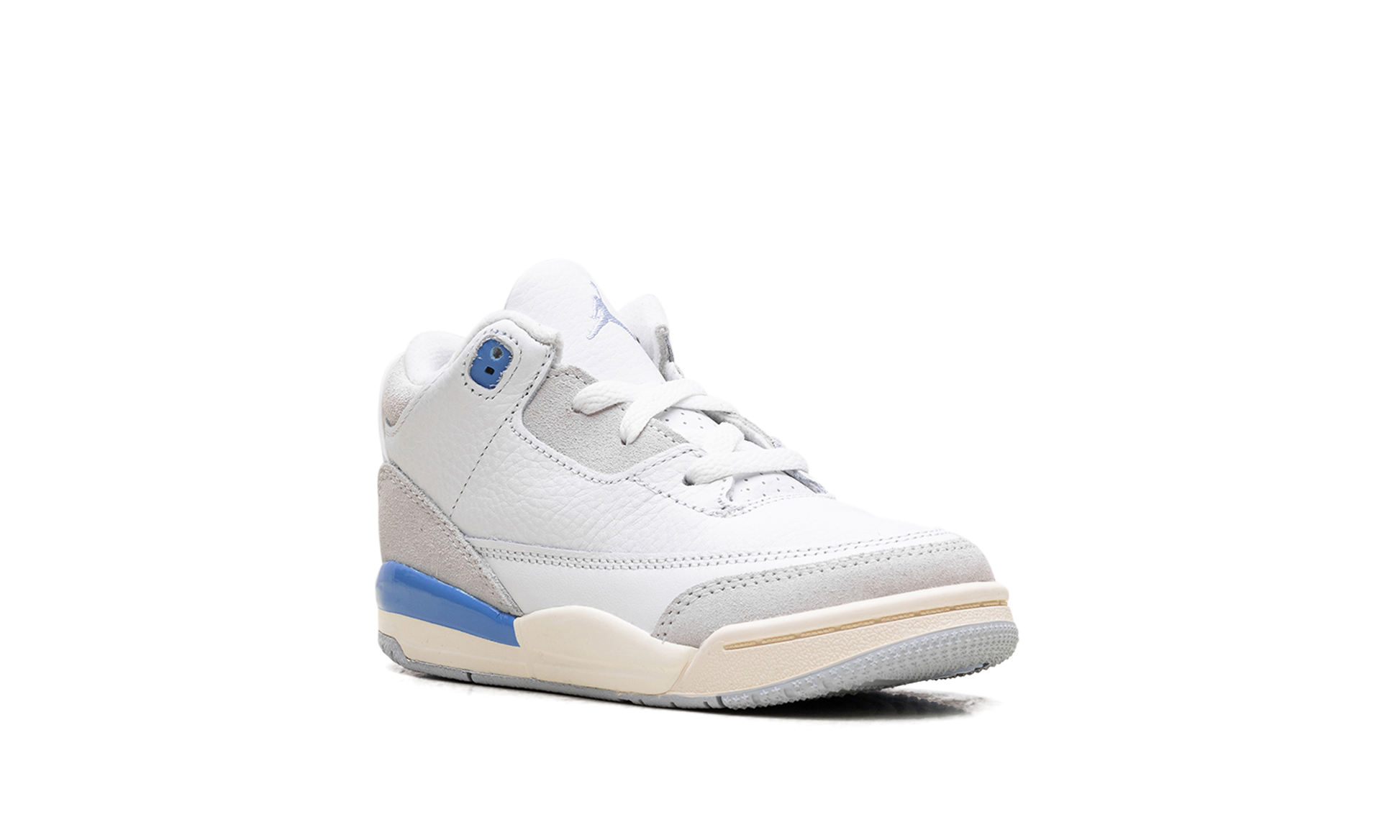 Start their journey off right with the Air Jordan 3 Retro TD "Lucky Shorts." This toddler-sized shoe commemorates Michael Jordan's superstition of wearing his UNC practice shorts under his game uniform. It features a Summit White leather upper with tasteful Photon Dust suede overlays. replacing the traditional elephant print for a cleaner look. Legend Blue accents pay homage to MJ's college roots. while supportive foam and a rubber outsole provide stable comfort for developing feet.