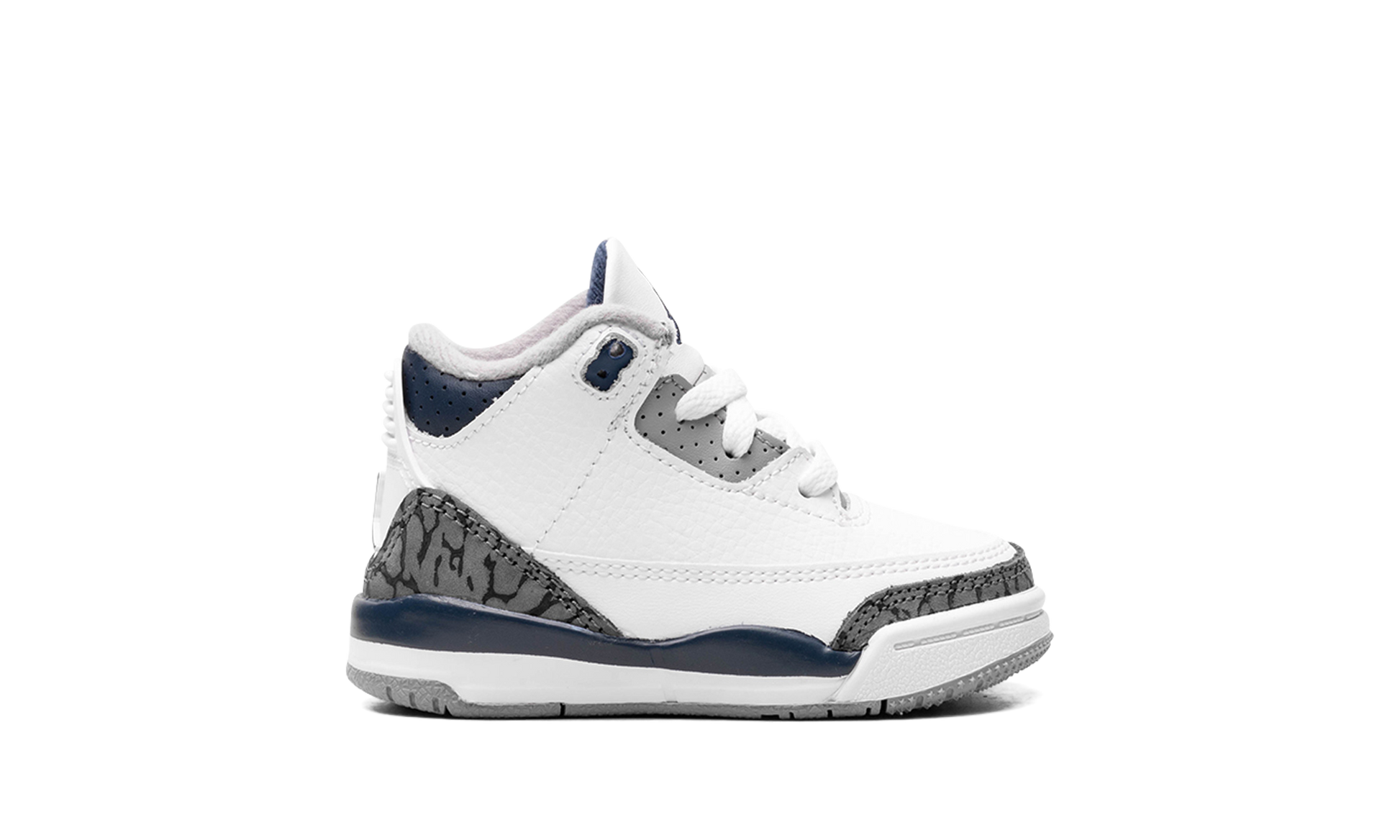 The Air Jordan 3 TD "Midnight Navy" is the toddler sizing of the retro basketball shoe with a timeless design that includes navy accents. Michael Jordan's third signature shoe in the “Midnight Navyâ€?colorway features a white leather construction with elephant print overlays on the toe and heel. A Midnight Navy-colored mudguard contrasts the look. as do the Midnight Navy eyelet holes. More Midnight Navy accenting is featured on the Jumpman on the white leather tongue and on the Jumpman on the heel. The white midsole has a visible Air bubble in the heel. A grey rubber outsole completes the look. Release date: January 13. 2024