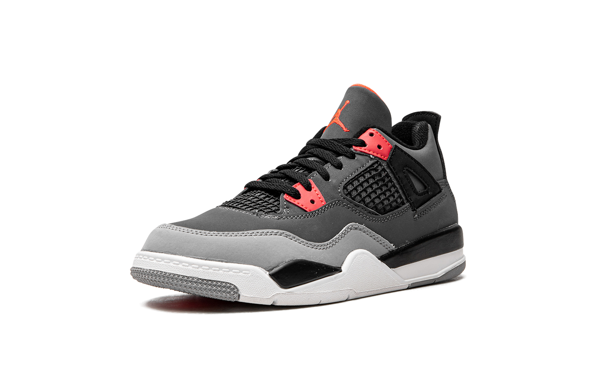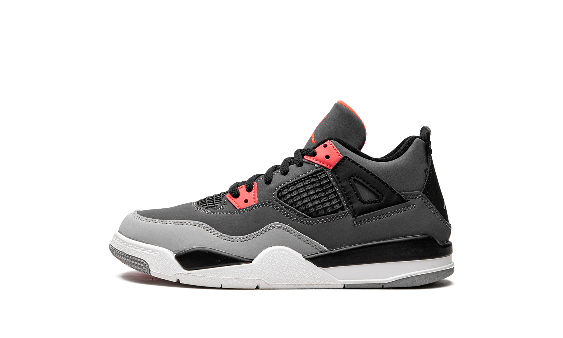 The Air Jordan 4 “Infraredâ€?is a preschool-sized version of the vintage basketball shoe in a colorway loosely inspired by the Chicago Bulls. Michael Jordan's former basketball team. The shoe features a synthetic nubuck upper in light and dark grey. Black accents can be found on the netting found on the tongue and mid-panel. on the “wings.â€?and inner lining. Lighter shades of grey appear on the toe and outsole. A light grey Jumpman is located on the black heel counter and an Infrared Jumpman is printed on the black nylon tongue tag. Additional Infrared detailing is found on the eyelets.