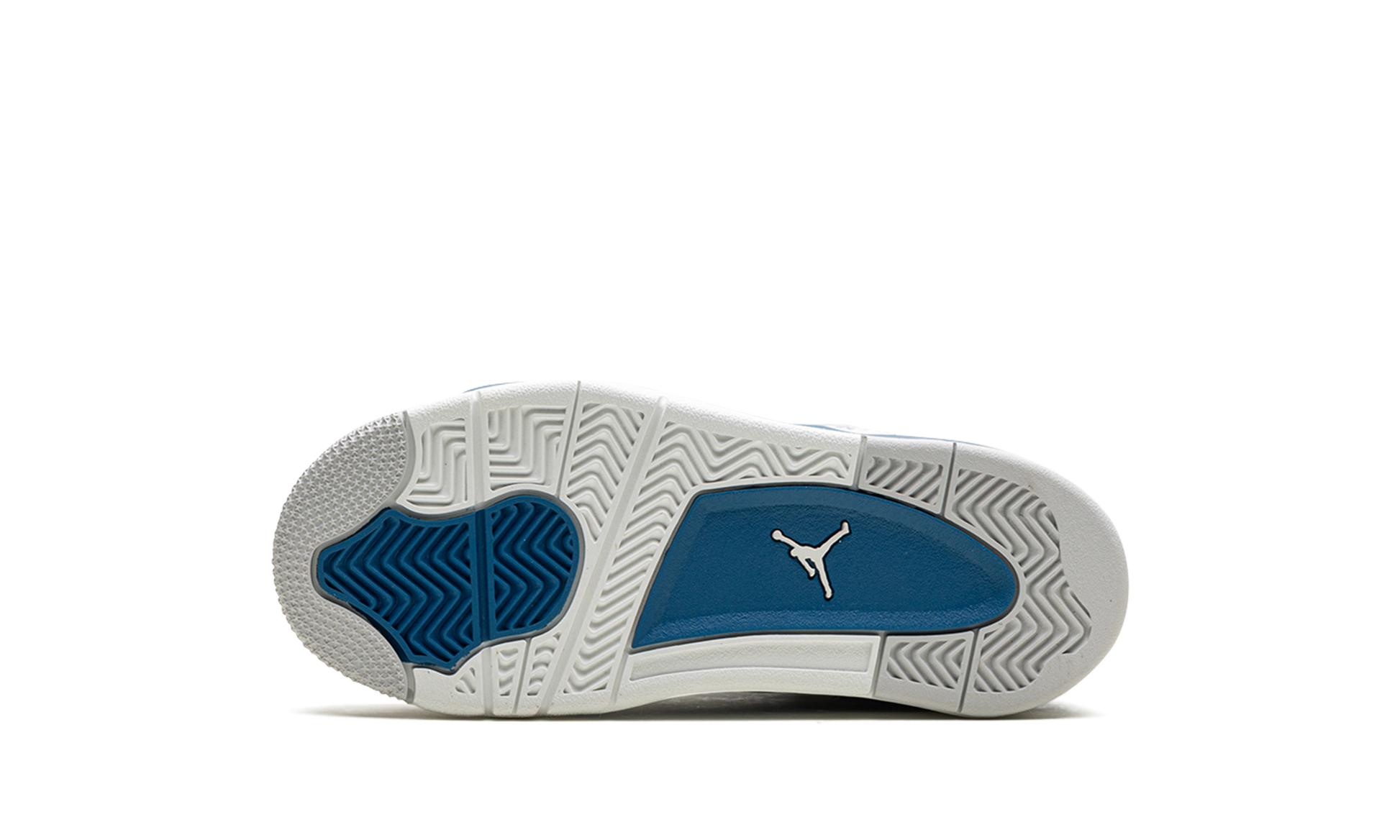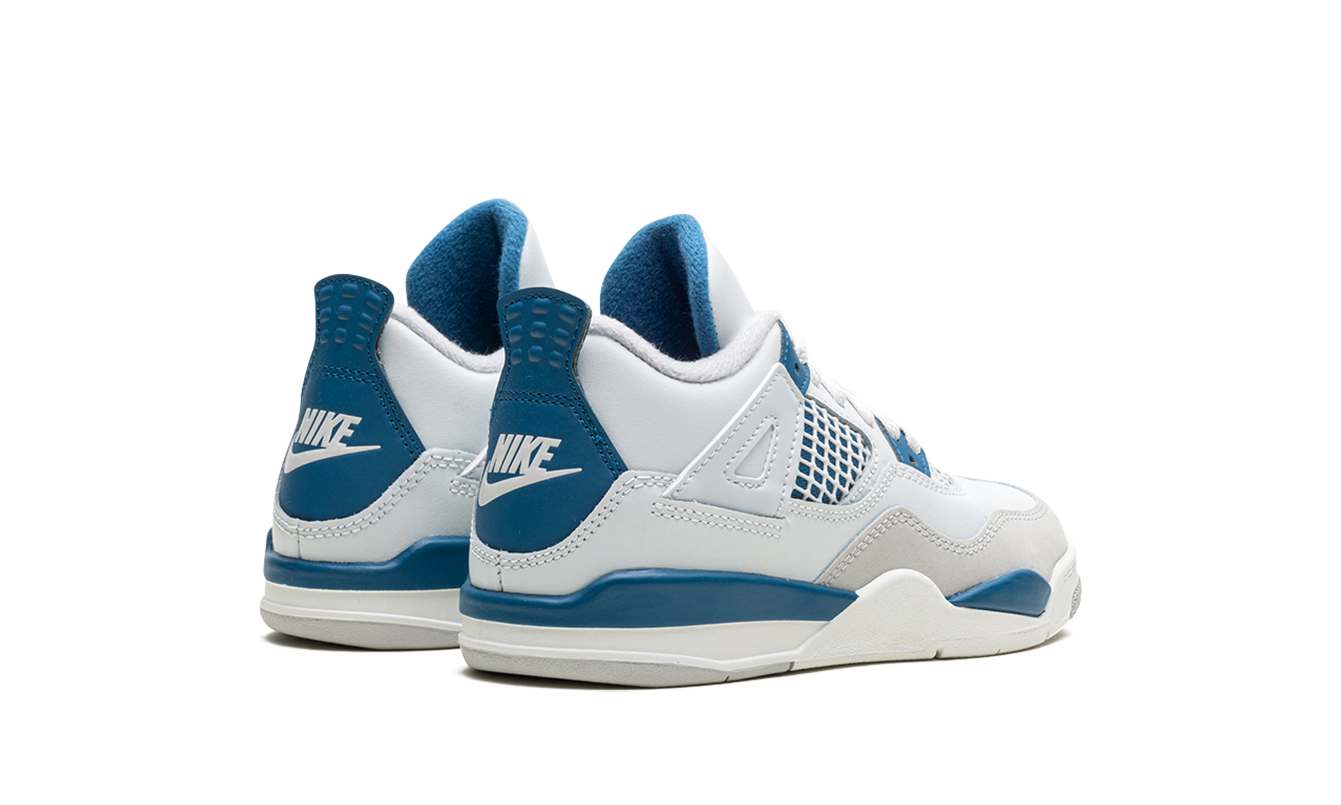 The Air Jordan 4 PS "Military Blue" is the preschool sizing of an original colorway of Michael Jordan's fourth signature shoe that was re-released in May 2024. The Jordan 4 “Military Blueâ€?is one of the retro basketball sneaker's original colorways. and one of its rarest. too. The style was only released twice before. in 1989 and 2006. until it was brought back in 2024. The modern version of the “Military Blueâ€?remains faithful to the original look. in that it features the same shape. color block. and “Nike Airâ€?branding as the '89 version. The shoe has a white leather upper with a Neutral Grey overlay on the toe. Additional Neutral Grey accenting appears on the lace holder “wings.â€?White netting is layered over Military Blue mesh on the mid-panel and tongue. More Military Blue accenting comes into play on the mudguard and lace eyelets. and on the heel counter with “Nike Airâ€?detailing. A blue Jumpman is found on the tongue. A white rubber midsole and grey rubber outsole complete the look
